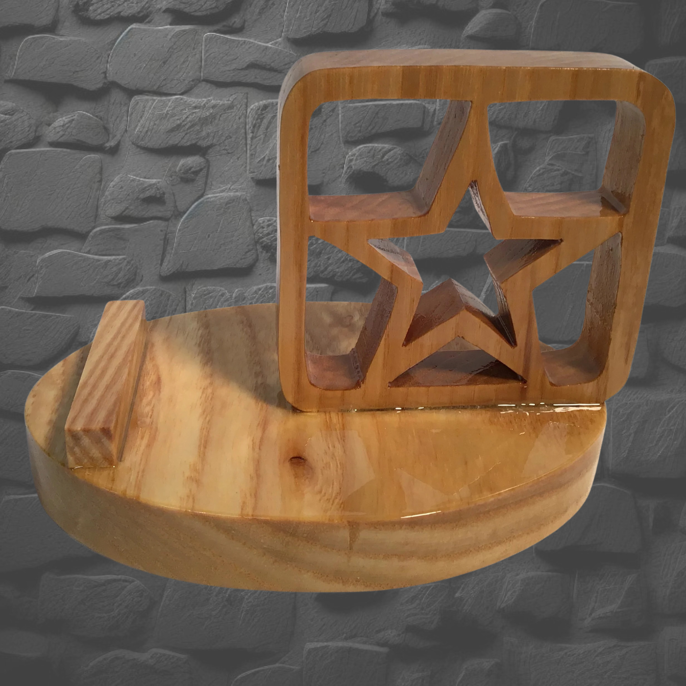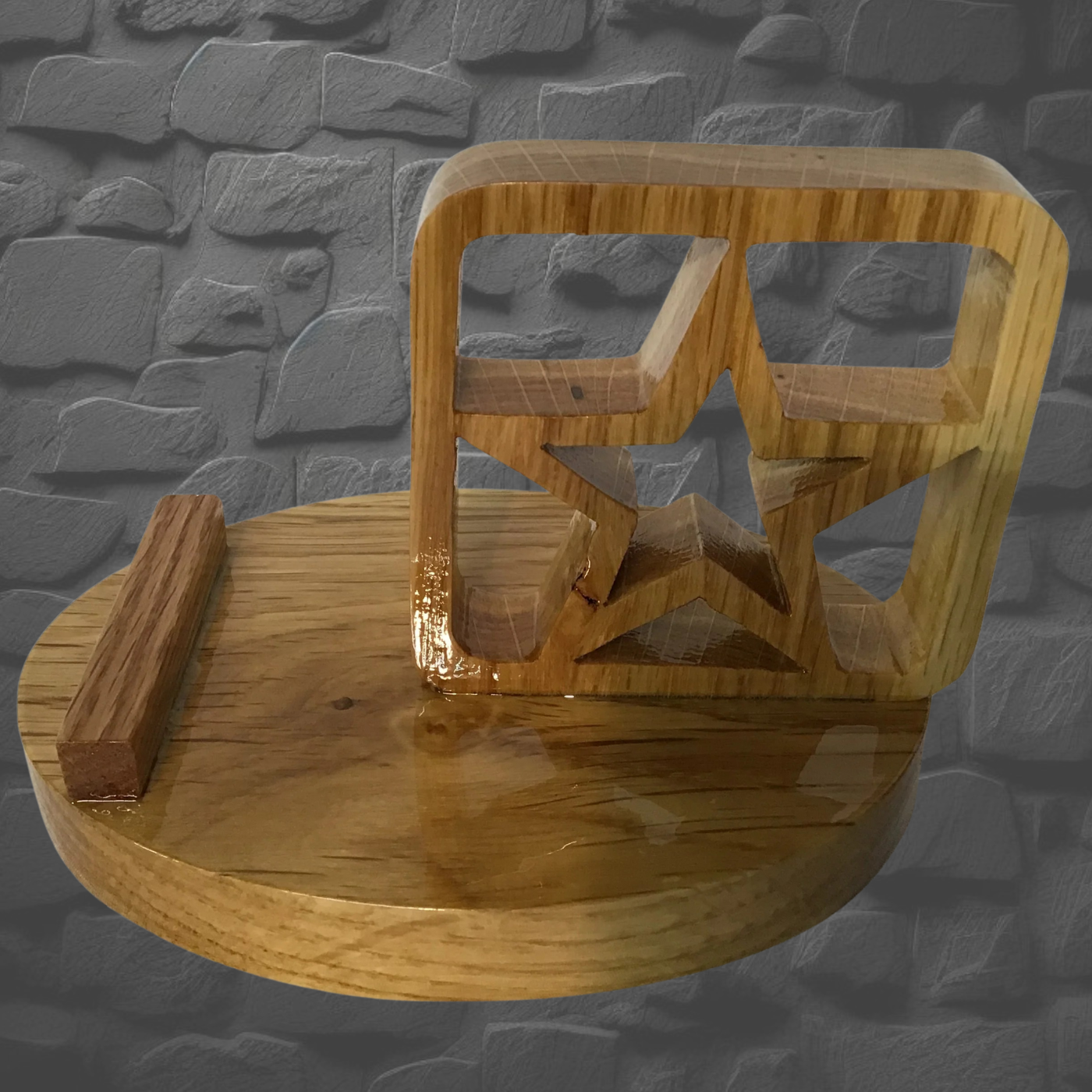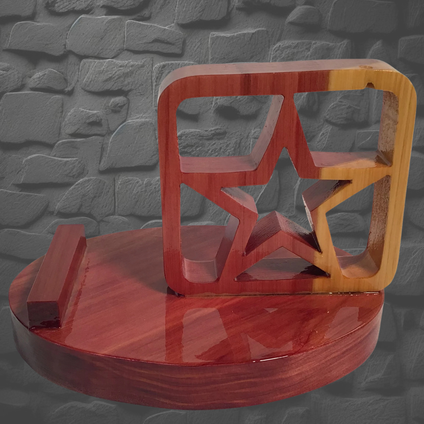 Army Insignia comes in 4 different woods, Cedar, Oak, Ash and Walnut. This piece is on the small base that we do. These pieces are hand cut with a scroll saw. Each piece is brush finished with 5 coats of Polyurethane to give it a deep, rich, thick coat. You can put your phone on it in a upright or sideways position so you can watch videos or even if you using your camera for video calls. If you put your phone sideways you can charge your phone in this position. They come in handy for various applications, like putting it beside your bed on the nightstand while you sleep so makes it easier to find. You can use it in the kitchen if you are trying to cook up a new recipe without it laying on the counter so your phone doesn't get wet or something poured on it. Plus it makes it easy for you to read the recipe hands free without having to pick it up to see it. (Photos are representation of the product, not the actual piece you will receive. Colors could variant some from piece to piece) (These pieces could break if dropped.)