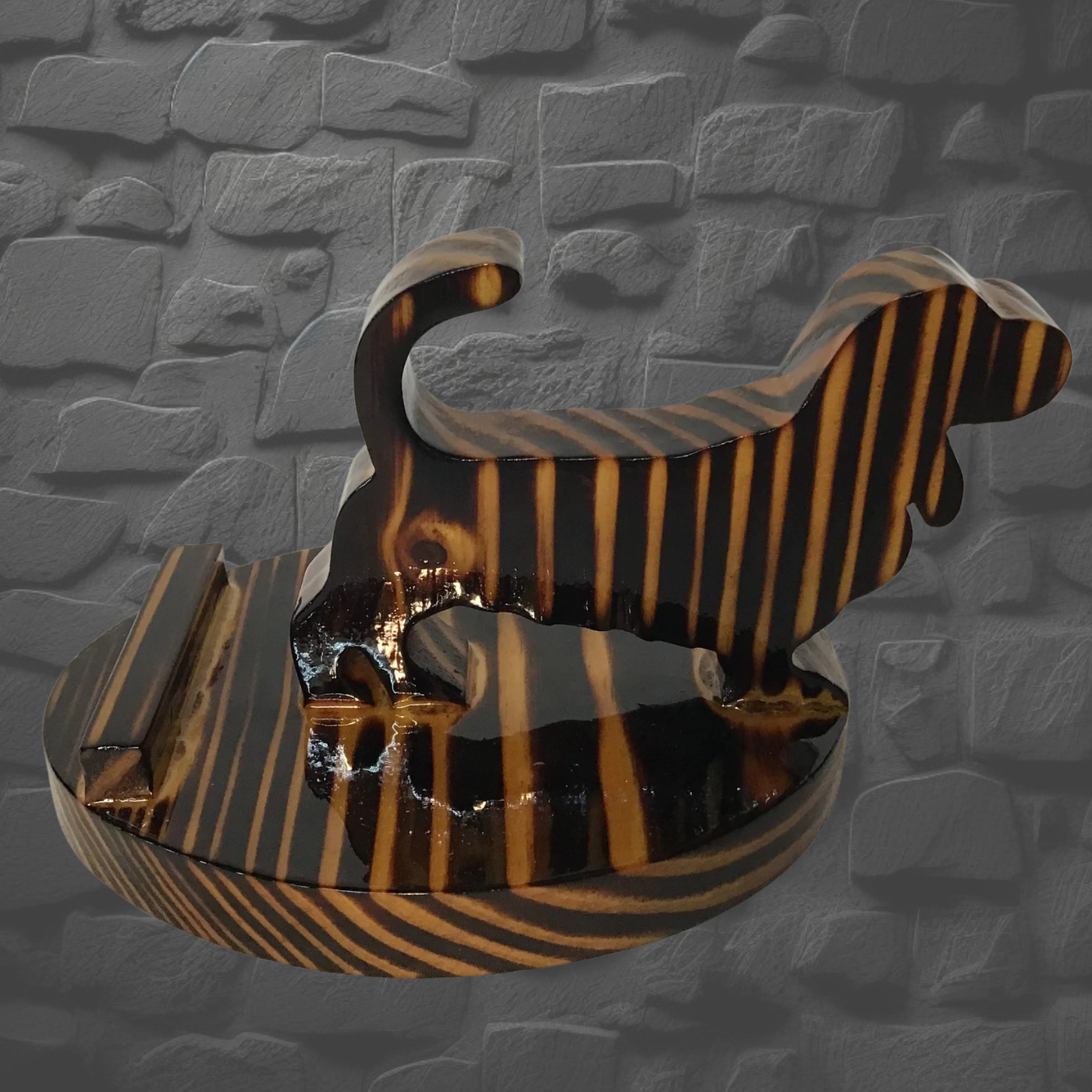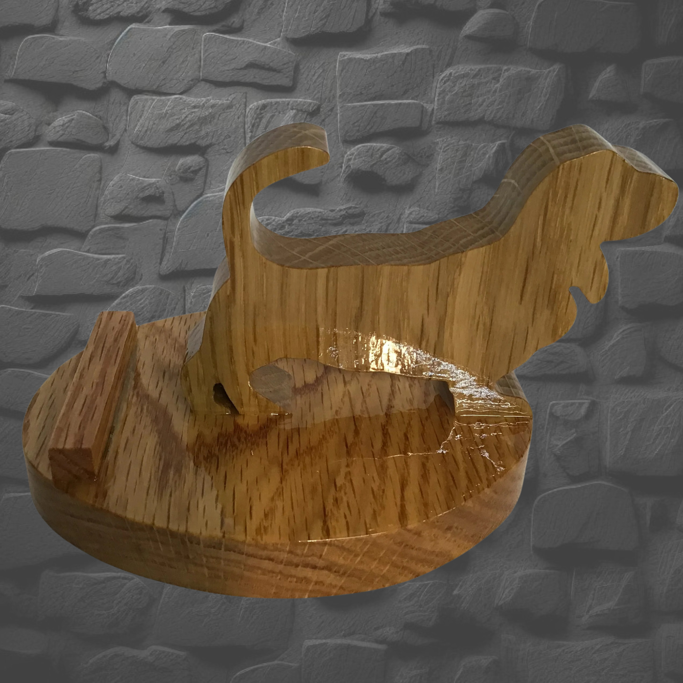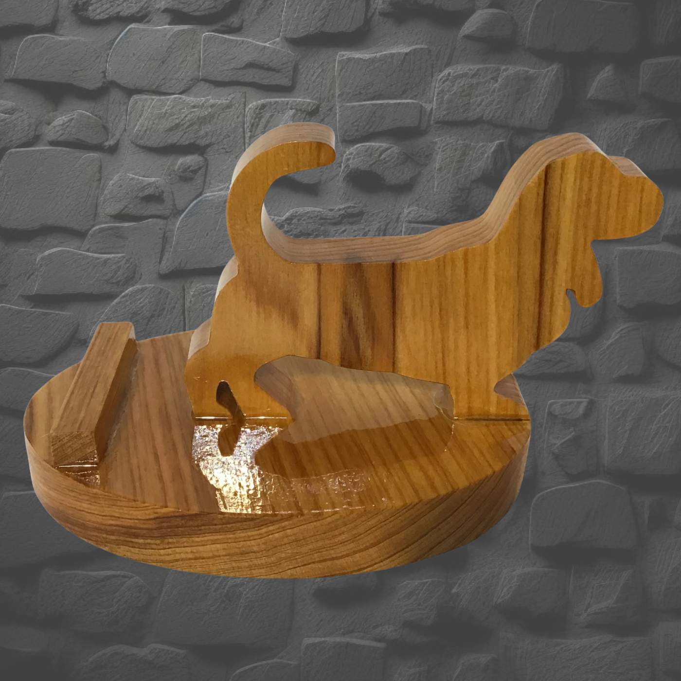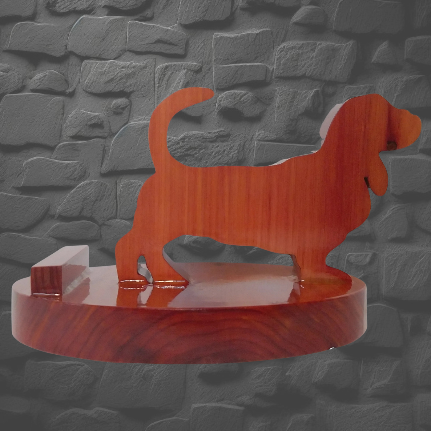 Basset Hound comes in 4 different woods, Cedar, Walnut, Burnt Pine and Oak. This piece is on the medium base that we do. These pieces are hand cut with a scroll saw. Each piece is brush finished with 5 coats of Polyurethane to give it a deep, rich, thick coat. You can put your phone on it in a upright or sideways position so you can watch videos or even if you using your camera for video calls. If you put your phone sideways you can charge your phone in this position. They come in handy for various applications, like putting it beside your bed on the nightstand while you sleep so makes it easier to find. You can use it in the kitchen if you are trying to cook up a new recipe without it laying on the counter so your phone doesn't get wet or something poured on it. Plus it makes it easy for you to read the recipe hands free without having to pick it up to see it. (Photos are representation of the product, not the actual piece you will receive. Colors could variant some from piece to piece) (These pieces could break if dropped.)
