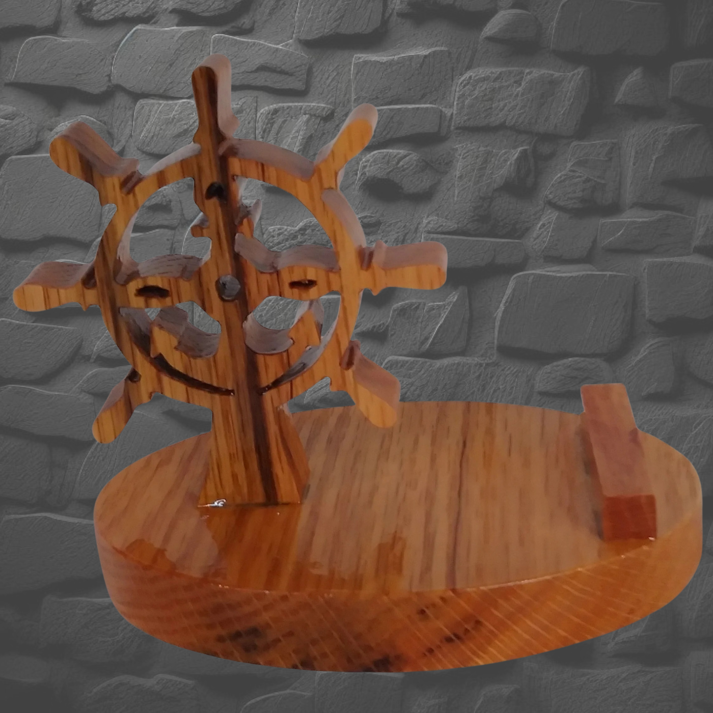 Boat Wheel/Anchor comes in 4 different woods, Cedar, Walnut, Oak and Ash. This piece is on the larger base that we do. These pieces are hand cut with a scroll saw. Each piece is brush finished with 5 coats of Polyurethane to give it a deep, rich, thick coat. You can put your phone on it in a upright or sideways position so you can watch videos or even if you using your camera for video calls. If you put your phone sideways you can charge your phone in this position. They come in handy for various applications, like putting it beside your bed on the nightstand while you sleep so makes it easier to find. You can use it in the kitchen if you are trying to cook up a new recipe without it laying on the counter so your phone doesn't get wet or something poured on it. Plus it makes it easy for you to read the recipe hands free without having to pick it up to see it. (Photos are representation of the product, not the actual piece you will receive. Colors could variant some from piece to piece) (These pieces could break if dropped.)