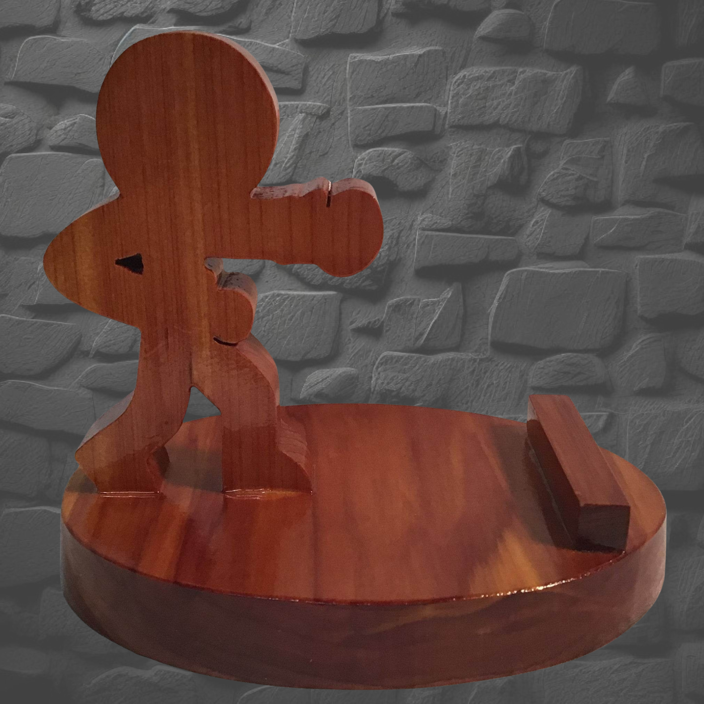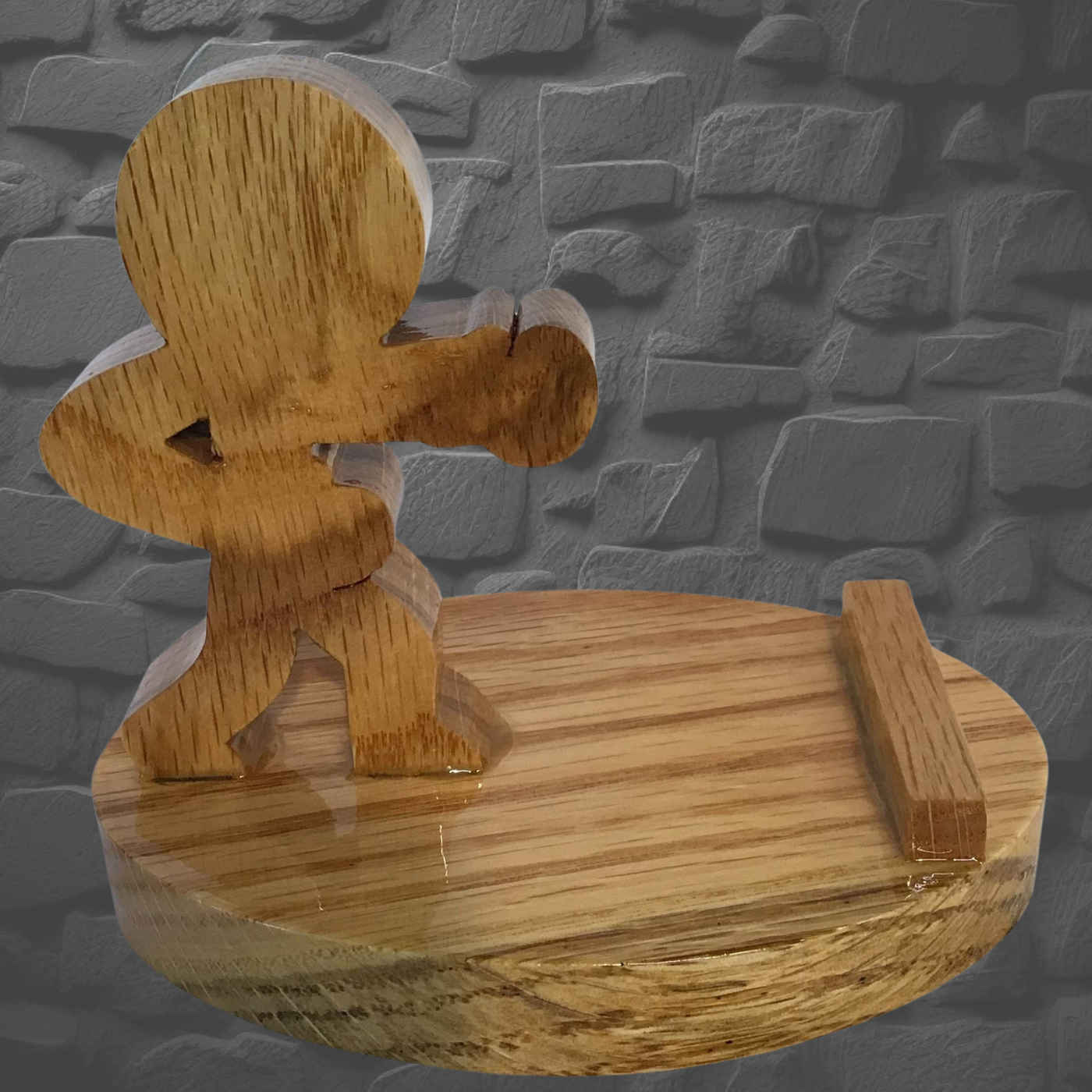 Boxing is a spirited wooden phone stand showcasing a fighter's stance, hand-cut from Cedar or Oak. This compact stand flexes with versatility—hold your phone upright or sideways for videos, calls, and charging. Ideal for bedside tables and kitchen counters, it keeps your device protected from spills and splashes. Crafted with meticulous detail and finished with five protective polyurethane coats, each piece is uniquely grained. Handle with care to keep this champ ready for action!