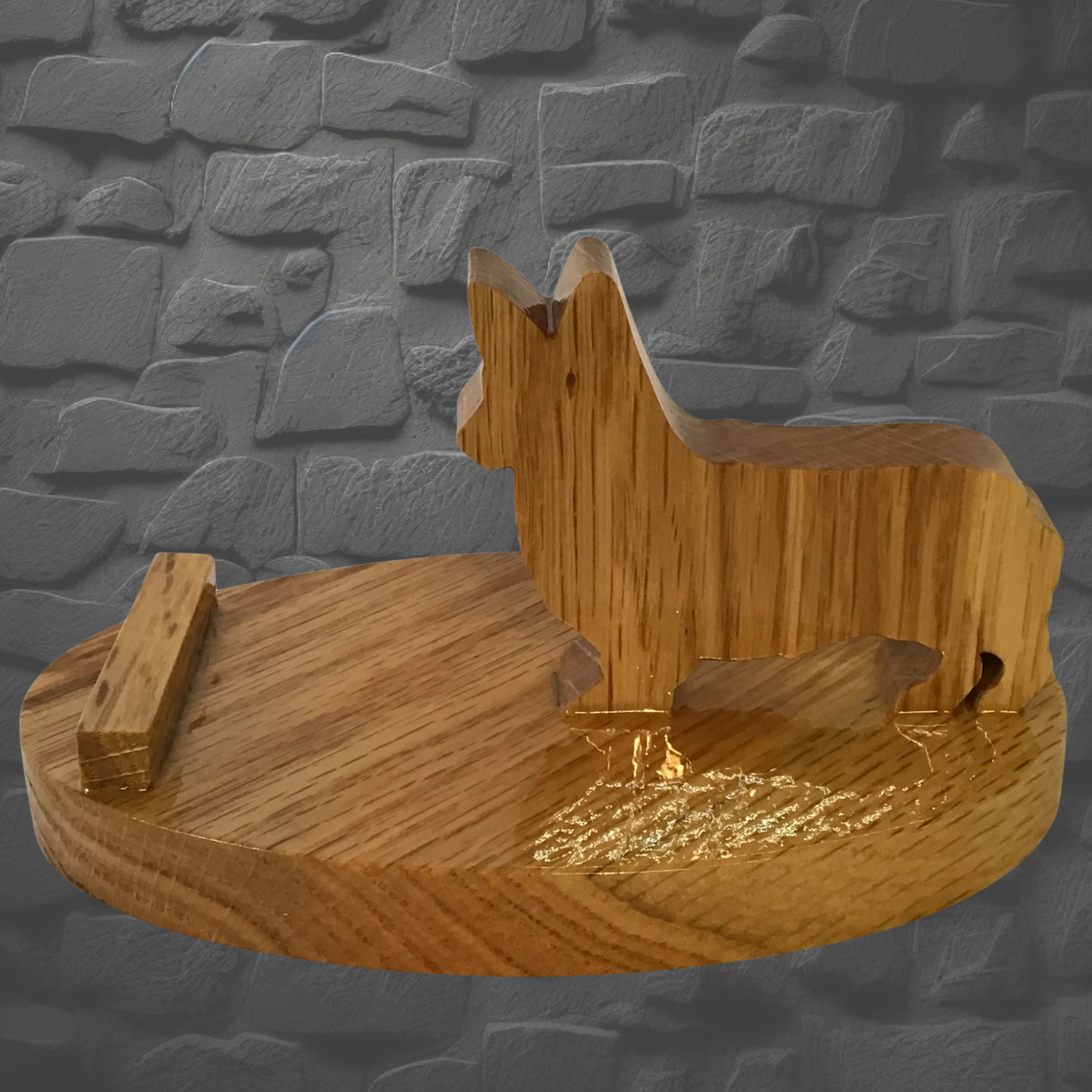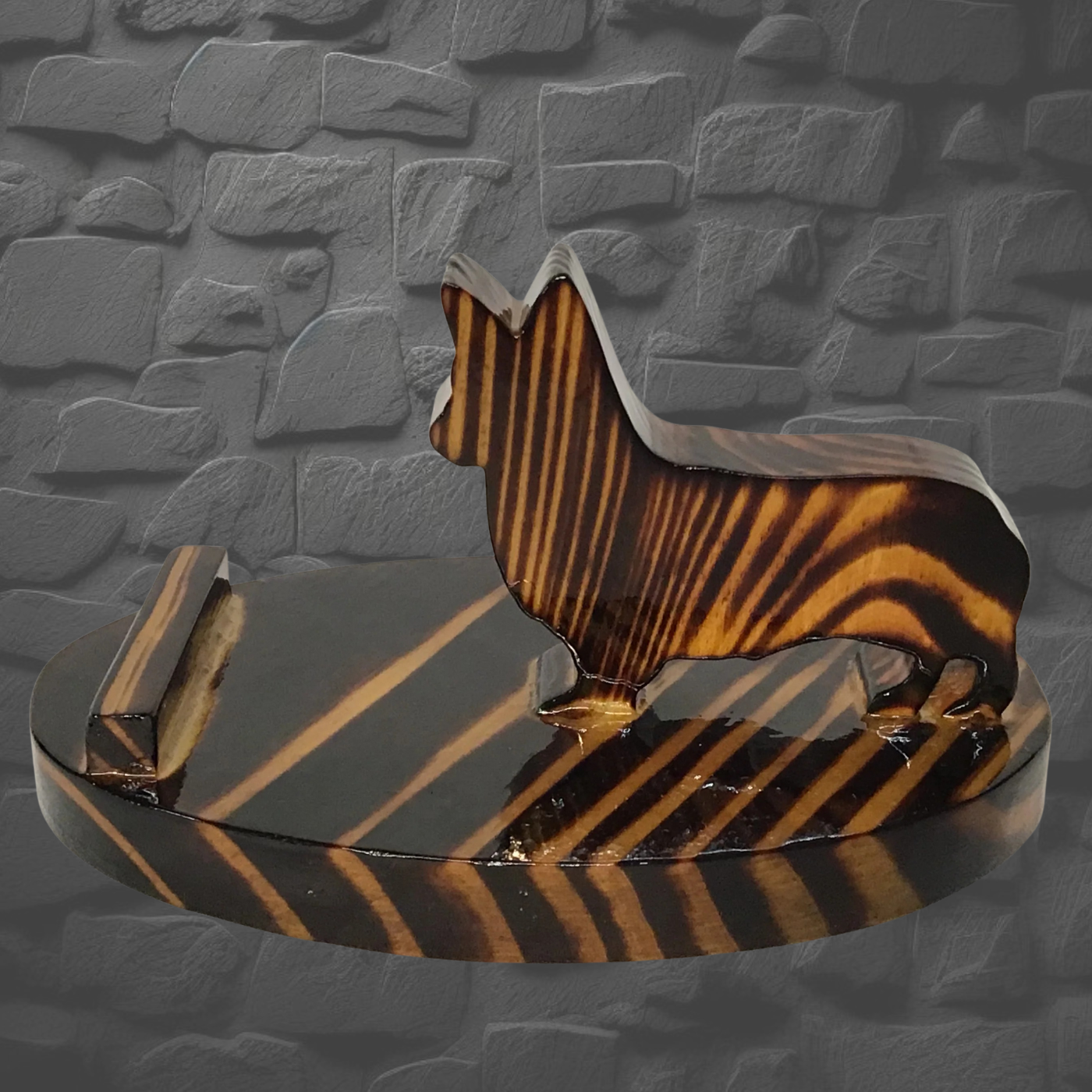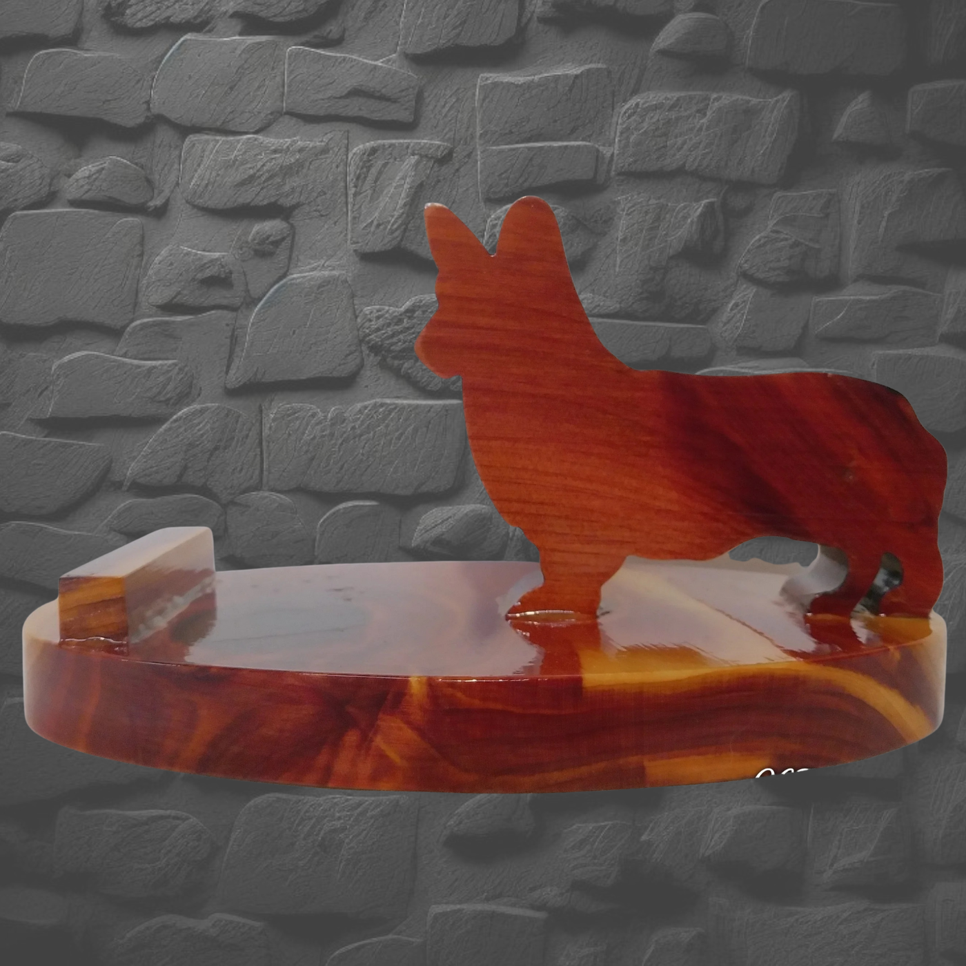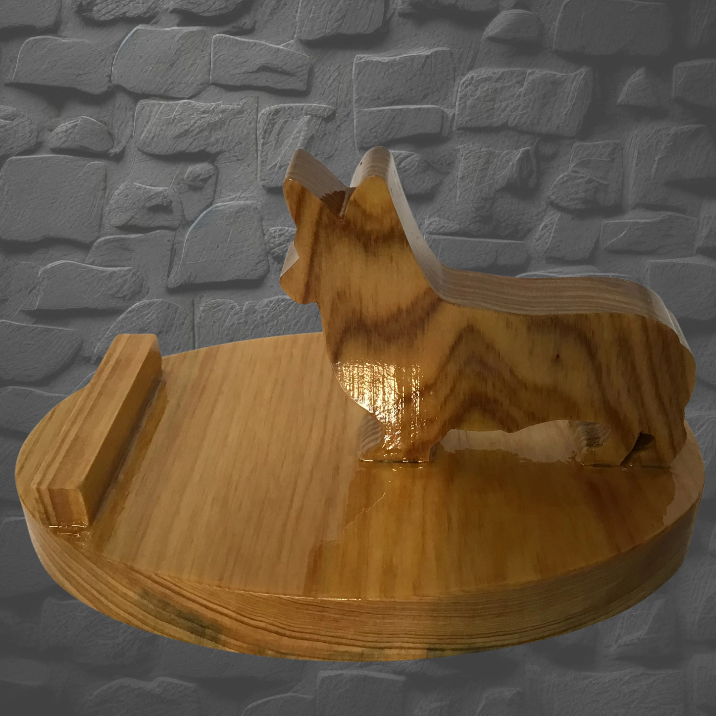 Corgi comes in 4 different woods, Cedar, Walnut, Burnt Pine and Oak. This piece is on the medium base that we do. These pieces are hand cut with a scroll saw. Each piece is brush finished with 5 coats of Polyurethane to give it a deep, rich, thick coat. You can put your phone on it in a upright or sideways position so you can watch videos or even if you using your camera for video calls. If you put your phone sideways you can charge your phone in this position. They come in handy for various applications, like putting it beside your bed on the nightstand while you sleep so makes it easier to find. You can use it in the kitchen if you are trying to cook up a new recipe without it laying on the counter so your phone doesn't get wet or something poured on it. Plus it makes it easy for you to read the recipe hands free without having to pick it up to see it. (Photos are representation of the product, not the actual piece you will receive. Colors could variant some from piece to piece) (These pieces could break if dropped.)