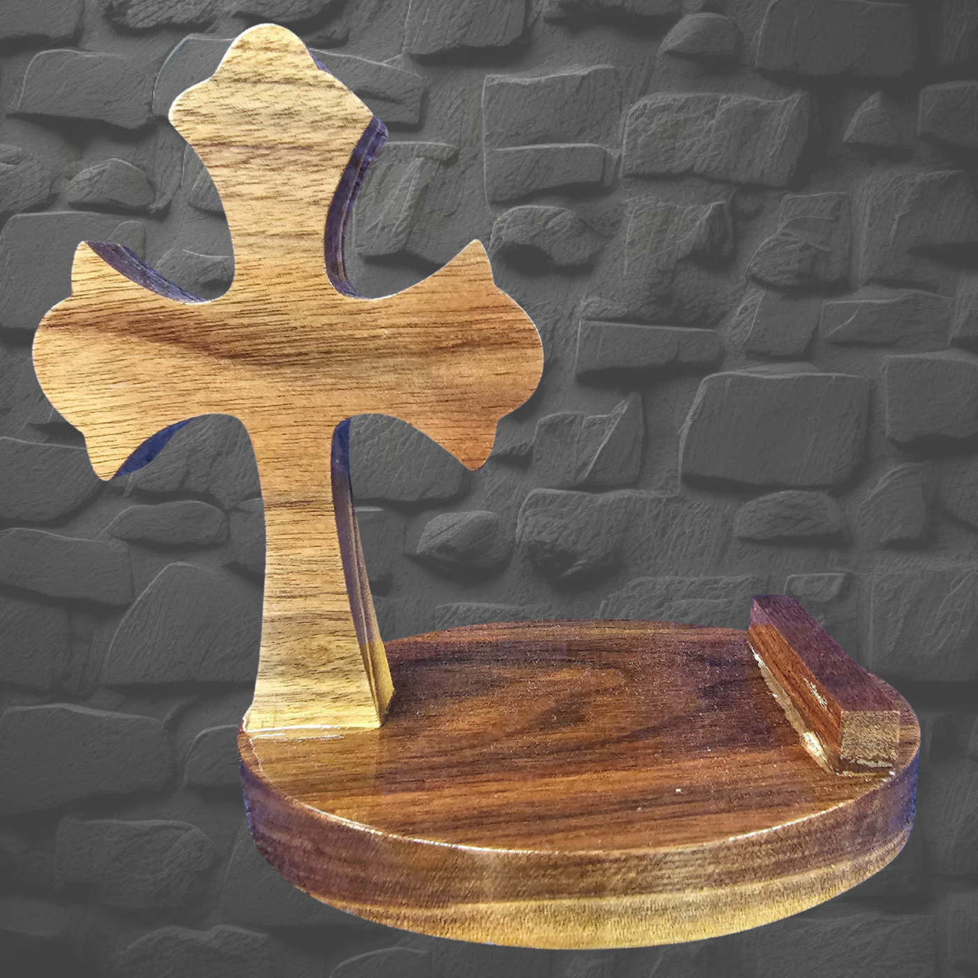 Cross #1 is a meaningful wooden phone stand hand-cut from Cedar, Walnut, Burnt Pine, or Oak. This petite stand holds your phone upright or sideways for videos, calls, and hands-free charging. A thoughtful addition to your nightstand or kitchen, it keeps your device protected from spills while you cook or relax. Each piece is individually crafted with a rich polyurethane finish and natural wood variations. Treat with care—this spiritual companion deserves gentle handling!