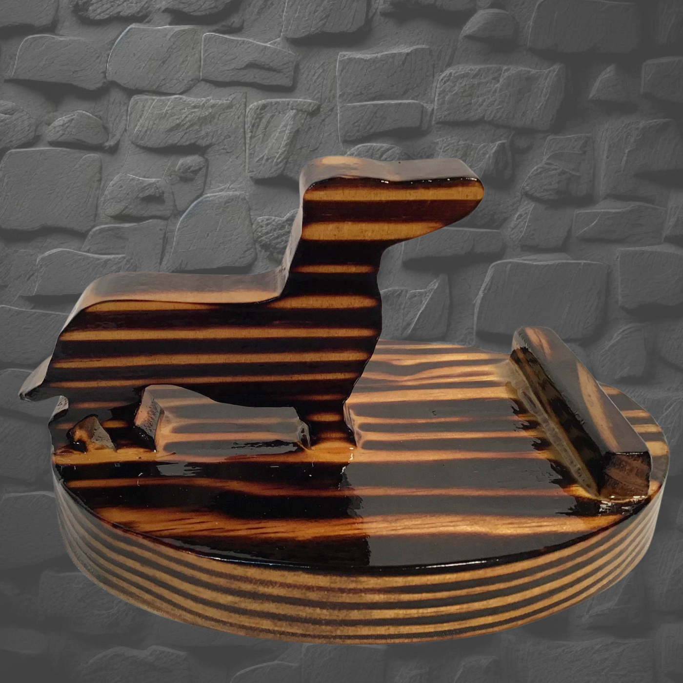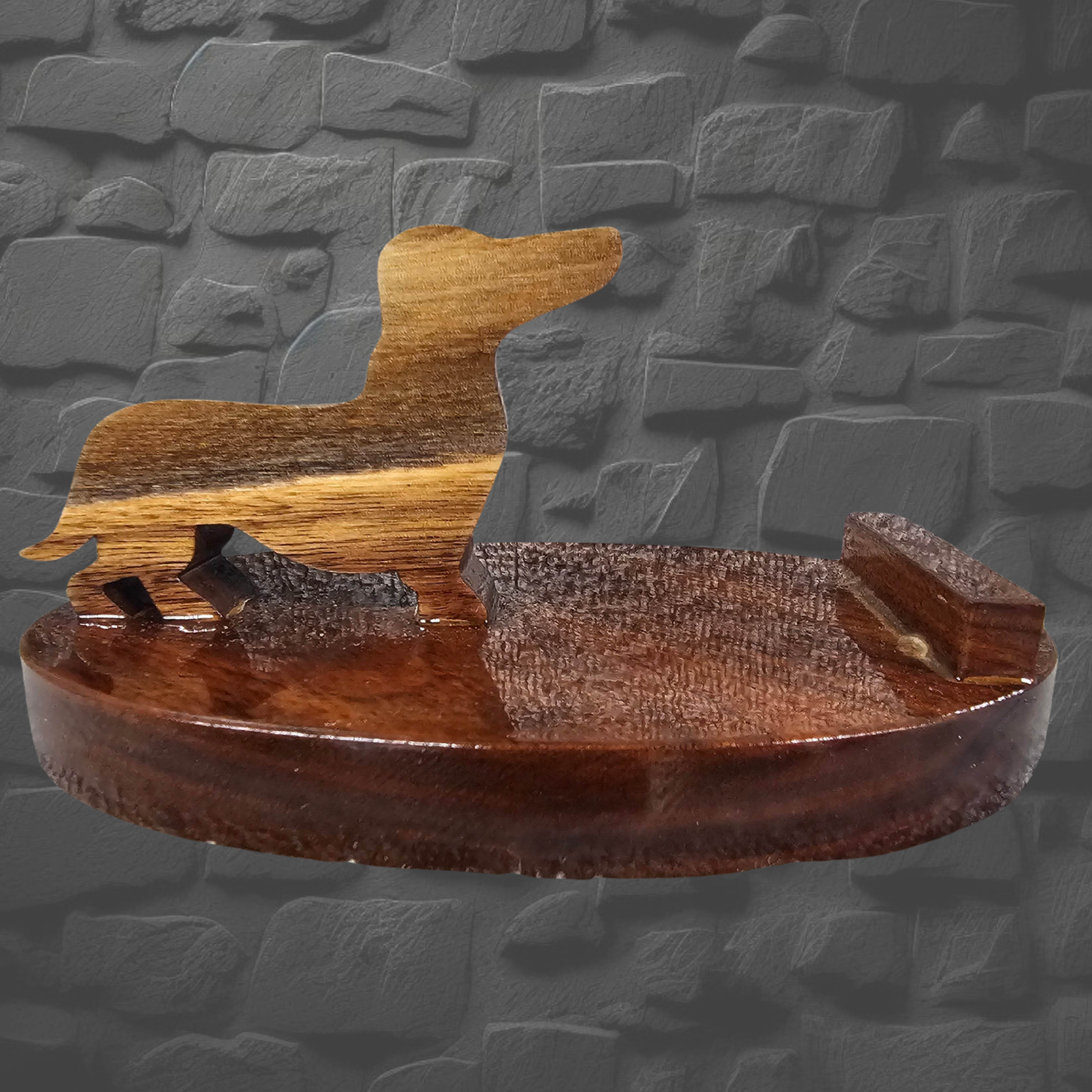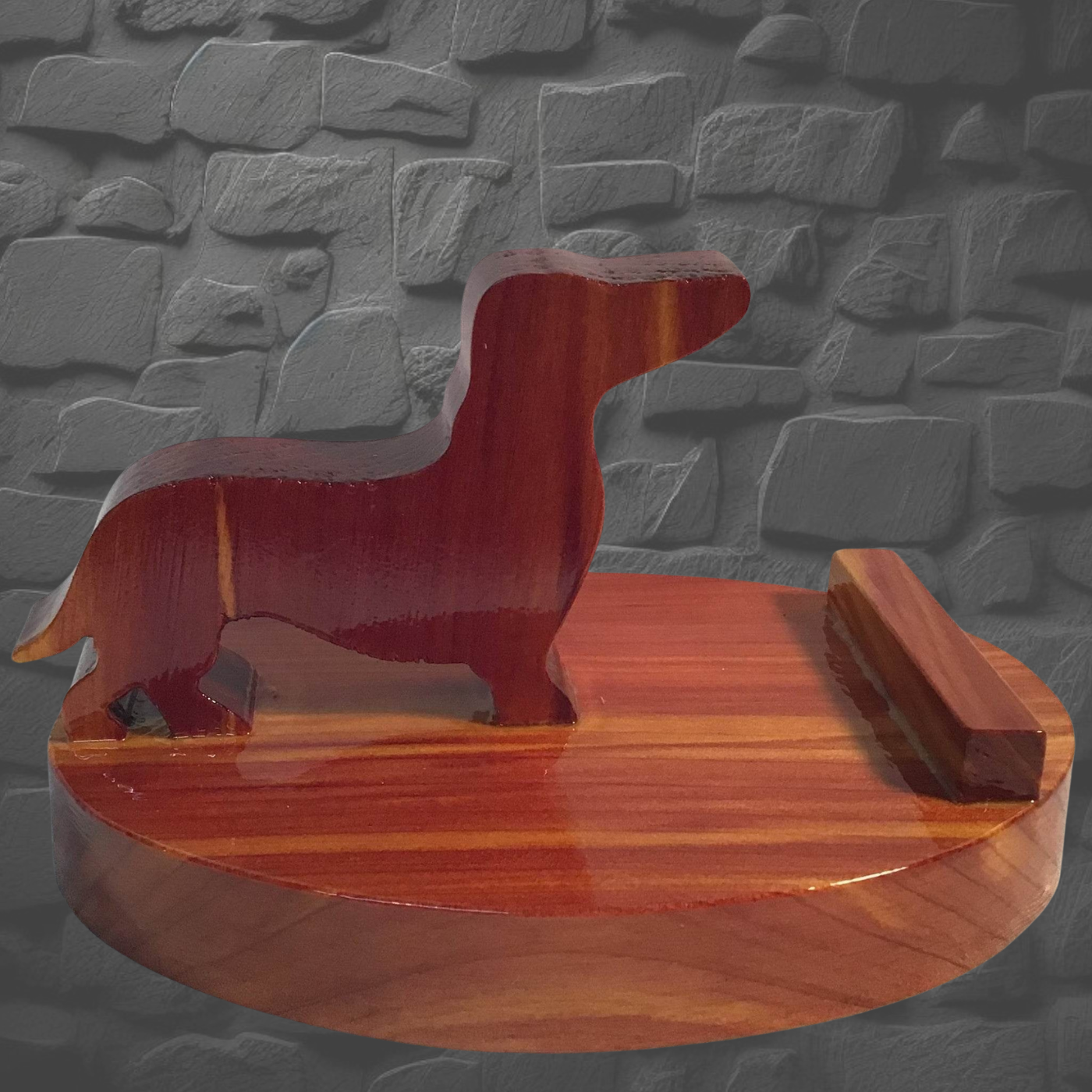 Dachshund is a whimsical wooden phone stand crafted from Cedar, Walnut, Burnt Pine, or Oak. This medium-sized stand positions your phone upright or sideways for videos, calls, and charging. Hand-cut with meticulous detail and finished with protective polyurethane, it's ideal for bedside tables or kitchen use. Each piece is one-of-a-kind with natural color variations. Treat it gently—it's a delicate work of art!