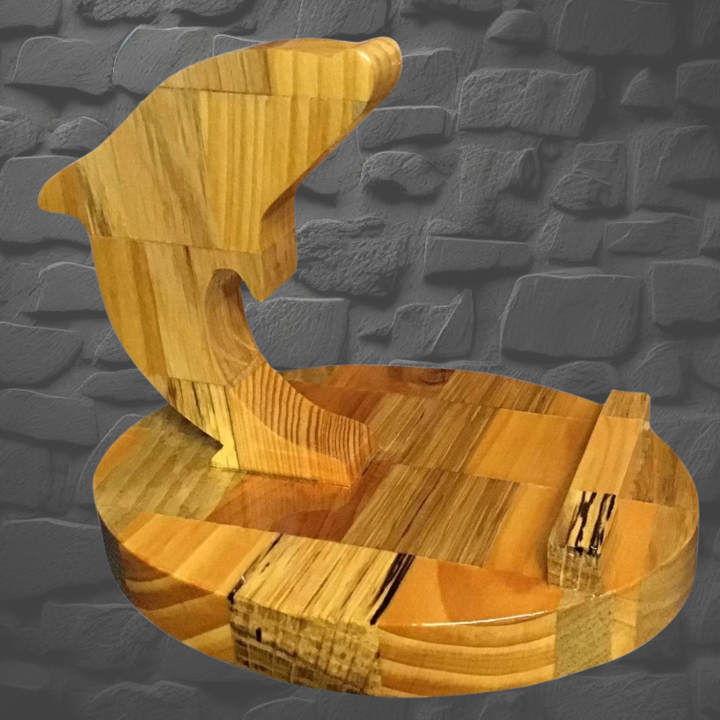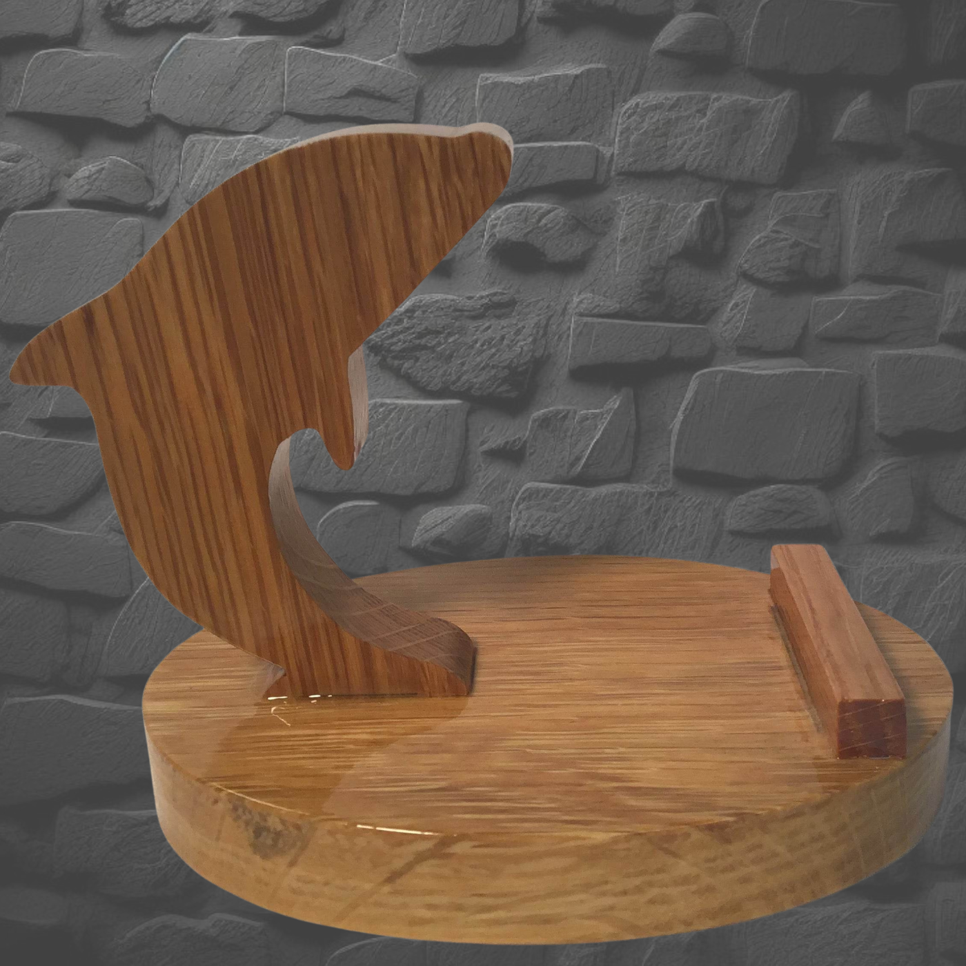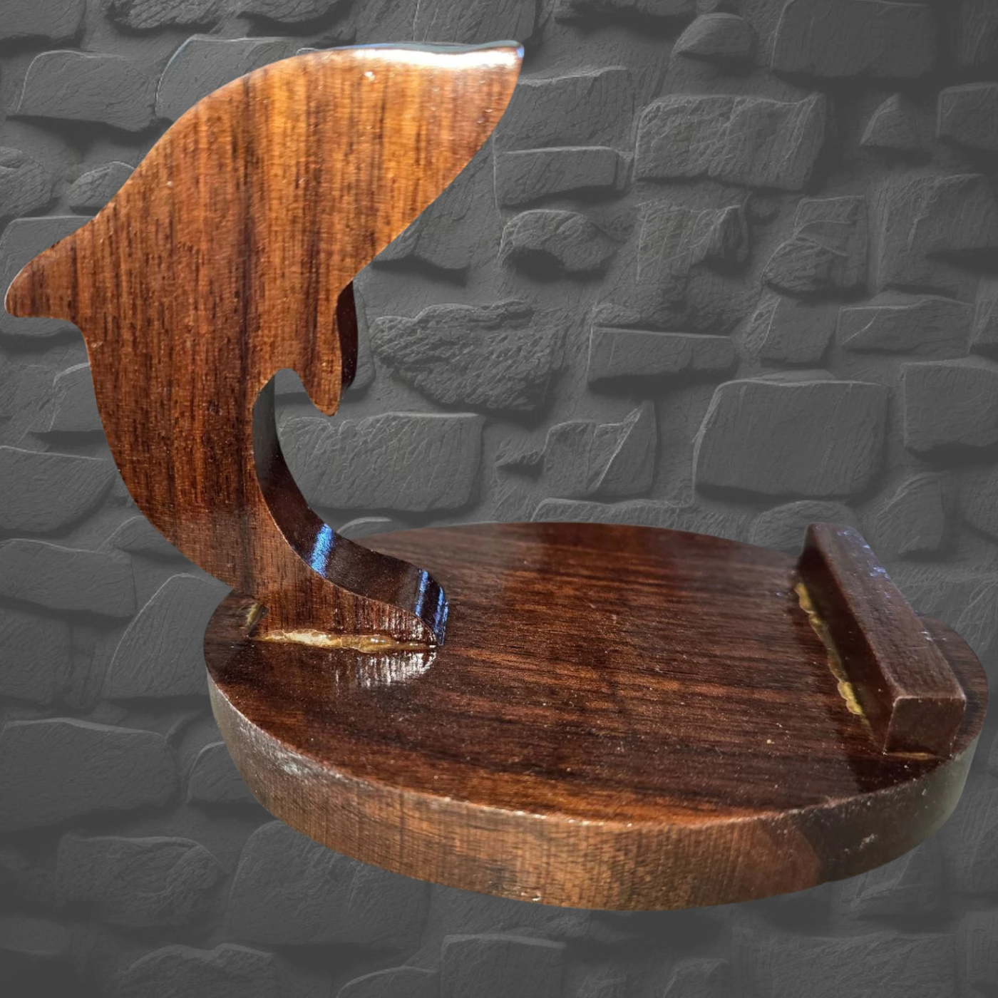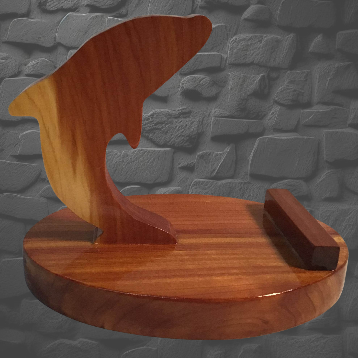 Handcrafted wooden dolphin phone stand in Cedar, Walnut, Burnt Pine, or Oak. Scroll-sawed and sealed with five protective coats of polyurethane. Position your phone upright for calls and videos, or sideways to charge while you cook, relax, or scroll. Compact base fits perfectly on nightstands and kitchen counters. Each piece is one-of-a-kind with natural wood variations. Fragile—keep away from drops.