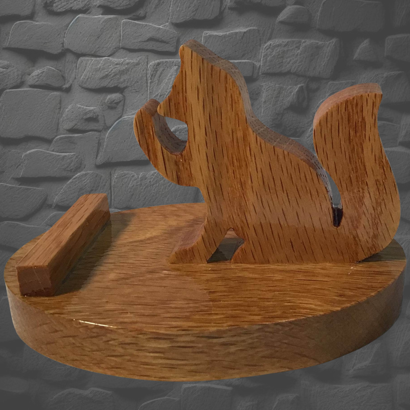 Introducing Fox—a charming wooden phone stand. Crafted from your choice of Cedar, Walnut, Burnt Pine, or Oak, each piece is individually cut with precision using a scroll saw, then finished with five protective coats of polyurethane for that gorgeous, deep luster. Position your phone upright for video calls or lay it sideways to catch your favorite shows—and yes, you can even charge it in landscape mode. Perfect for bedside browsing, kitchen recipe reading, or anywhere you need hands-free phone access. Compact base keeps it stable and unobtrusive. Note: Wood grain and color may vary slightly between pieces, and these beauties prefer a gentle touch.