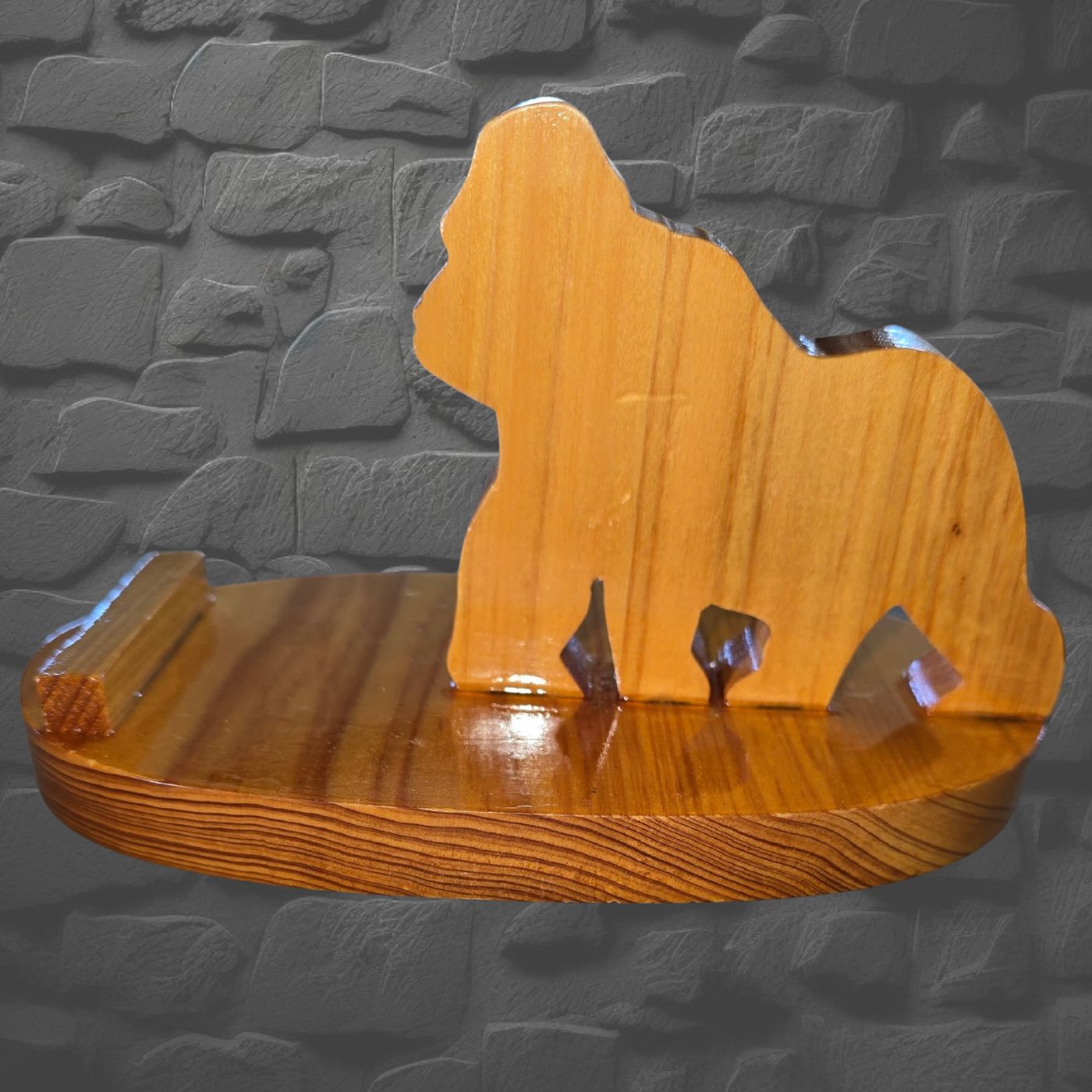 Gorilla comes in 4 different woods, Cedar, Walnut, Burnt Pine and Oak. This piece is on the larger base that we do. These pieces are hand cut with a scroll saw. Each piece is brush finished with 5 coats of Polyurethane to give it a deep, rich, thick coat. You can put your phone on it in a upright or sideways position so you can watch videos or even if you using your camera for video calls. If you put your phone sideways you can charge your phone in this position. They come in handy for various applications, like putting it beside your bed on the nightstand while you sleep so makes it easier to find. You can use it in the kitchen if you are trying to cook up a new recipe without it laying on the counter so your phone doesn't get wet or something poured on it. Plus it makes it easy for you to read the recipe hands free without having to pick it up to see it. (Photos are representation of the product, not the actual piece you will receive. Colors could variant some from piece to piece) (These pieces could break if dropped.)