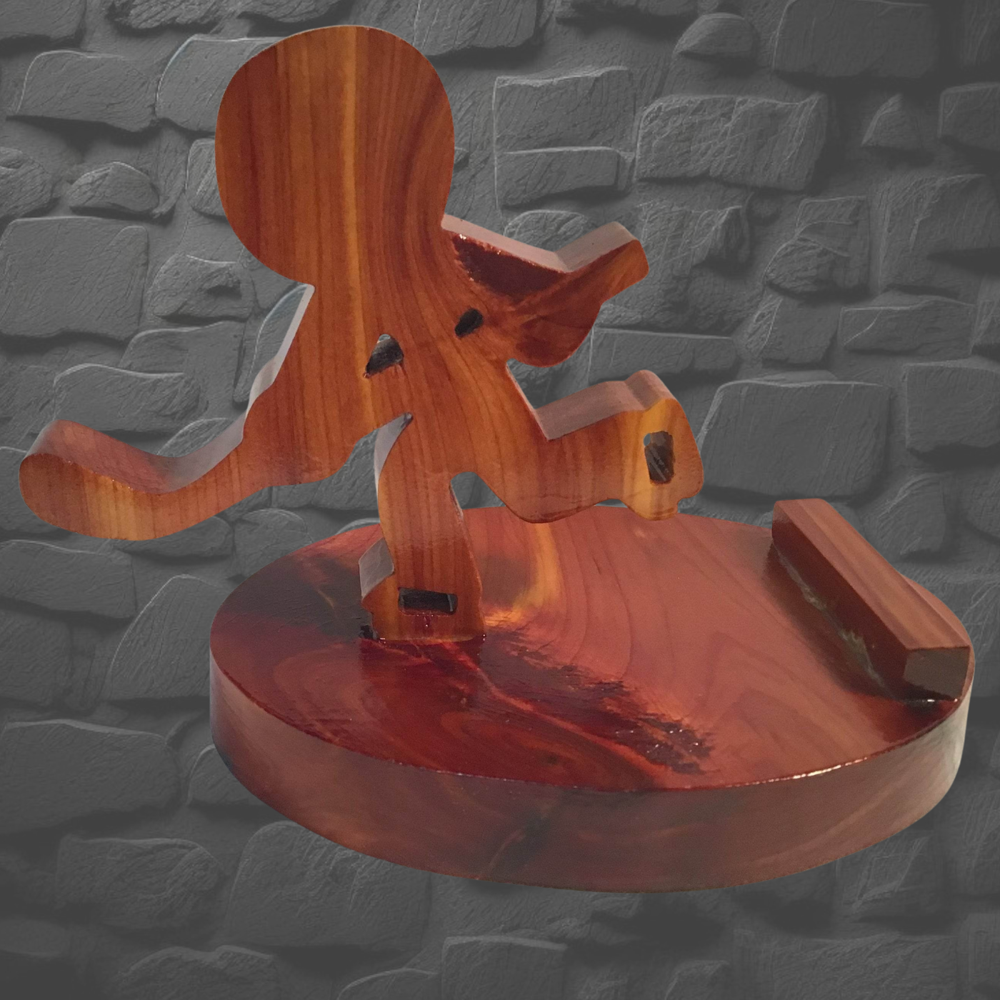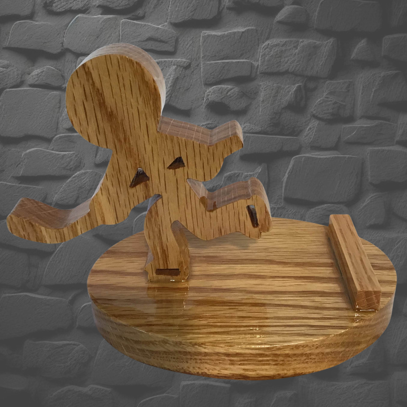 Hockey Player is a dynamic wooden phone stand featuring an athlete mid-stride, hand-cut from Cedar or Oak. This compact stand scores big with versatility—position your phone upright or sideways for videos, calls, and hands-free charging. Perfect for nightstands and kitchens, it shields your device from spills and splatters. Finished with five protective polyurethane coats, each piece showcases unique wood grain and natural color variation. Handle with care—this MVP deserves respect!
