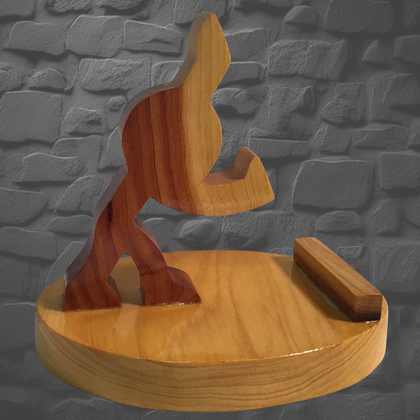 Person #2 is a charming cedar phone stand handcrafted with a scroll saw and finished with five protective coats of polyurethane. This compact piece holds your phone upright or sideways—perfect for video calls, recipe reading, or bedside browsing. Charge while positioned horizontally, or prop it on your nightstand for easy access. Each hand-cut stand is one-of-a-kind, with natural wood variations. Handle with care, as wood can be delicate when dropped.