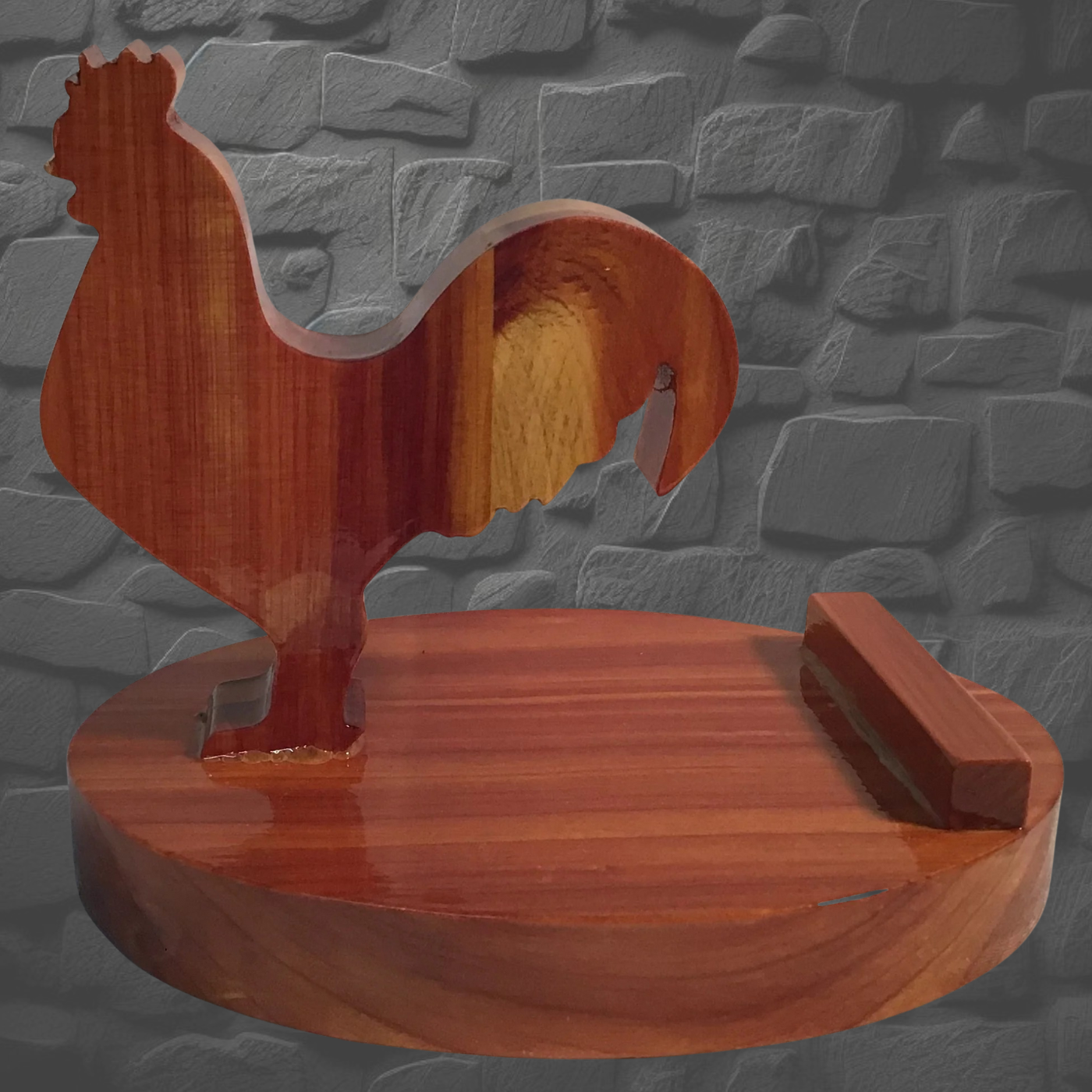 This charming wooden rooster keeps your phone within reach and protected. Choose from Cedar, Walnut, Burnt Pine, or Oak, each hand-cut and finished with five protective polyurethane coats. Position it upright for videos and calls, or sideways to charge while reading recipes hands-free. A delightful accent for your nightstand or kitchen counter.