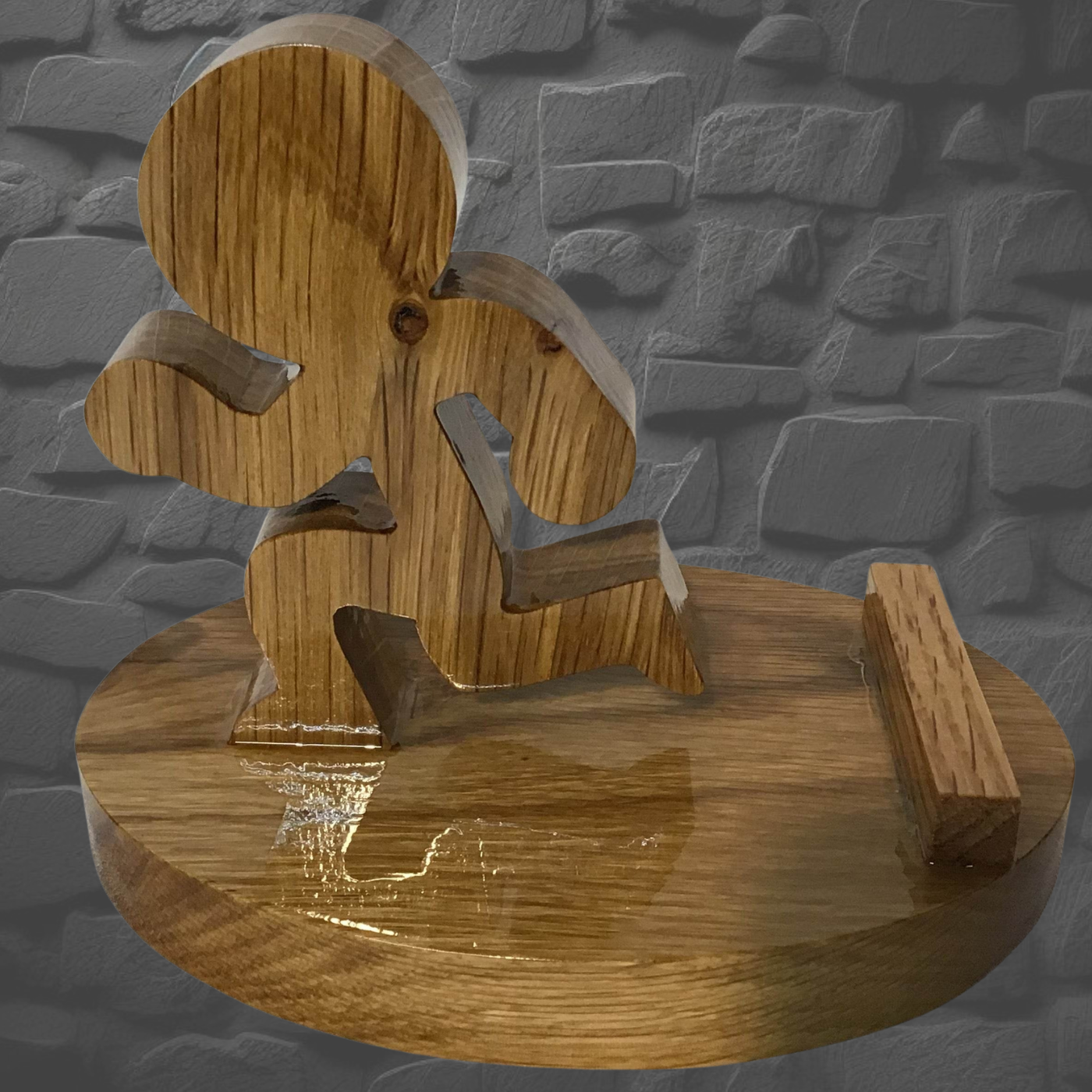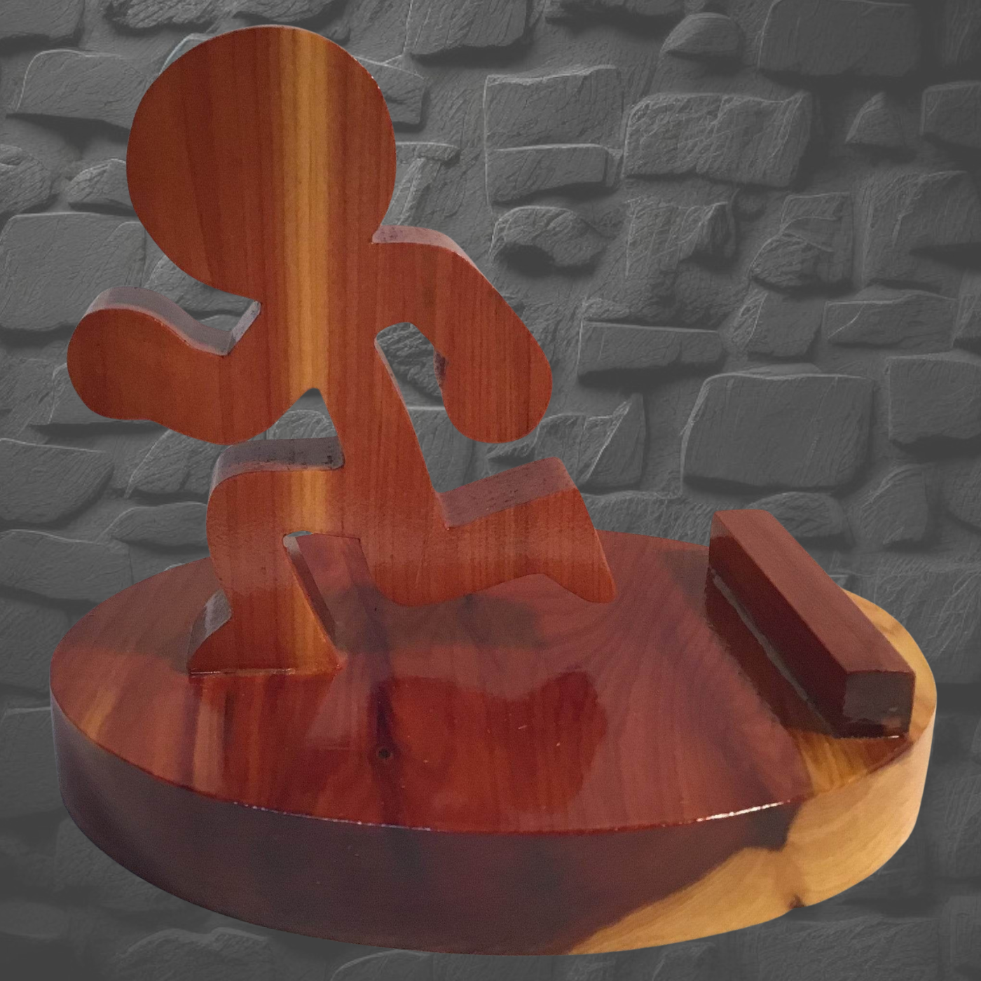 Handcrafted wooden runner that doubles as your phone's best friend! Choose between beautiful Cedar or Oak, each piece individually cut with a scroll saw and finished with five protective coats of polyurethane. Display your phone upright or sideways—perfect for video calls, recipe reading, or bedside browsing. Charge while positioned horizontally. Small base design fits anywhere you need it. Each piece is unique, so colors may vary slightly.