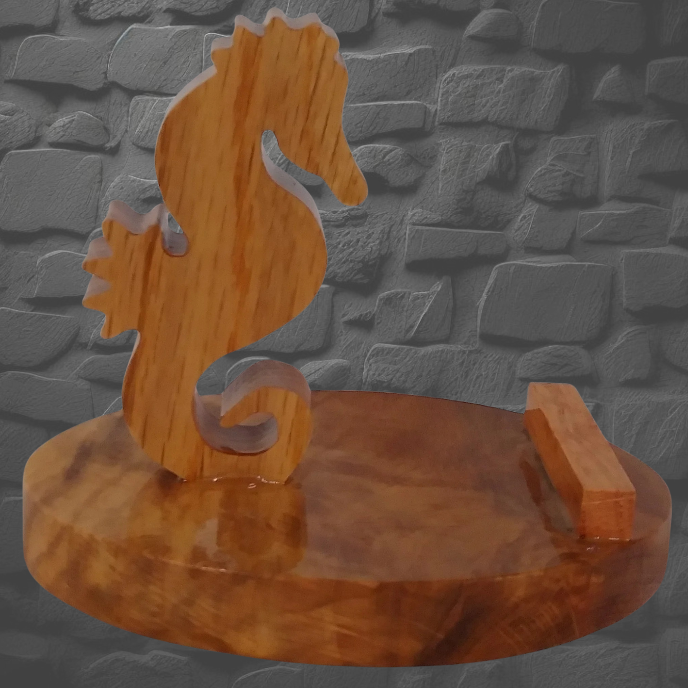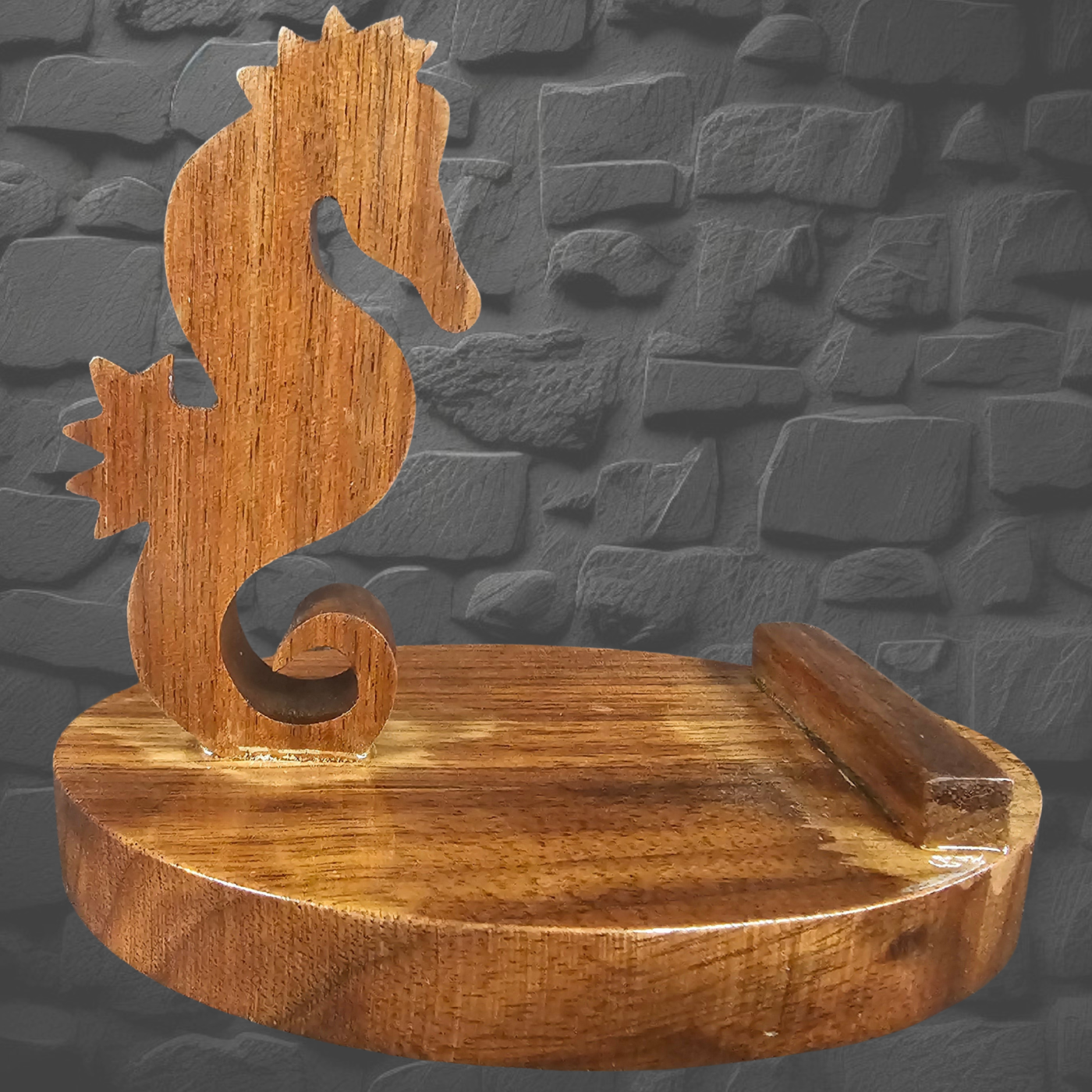 Introducing the Seahorse—a charming hand-cut wooden phone stand that's as practical as it is delightful. Choose from Cedar, Burnt Pine, Oak, or Walnut, each finished with five protective coats of polyurethane. Position your phone upright or sideways for video calls, recipe browsing, or bedside convenience. Charge while it sits sideways. A versatile companion for your kitchen, nightstand, or anywhere you need hands-free viewing. Each piece is uniquely crafted, so colors may vary slightly.
