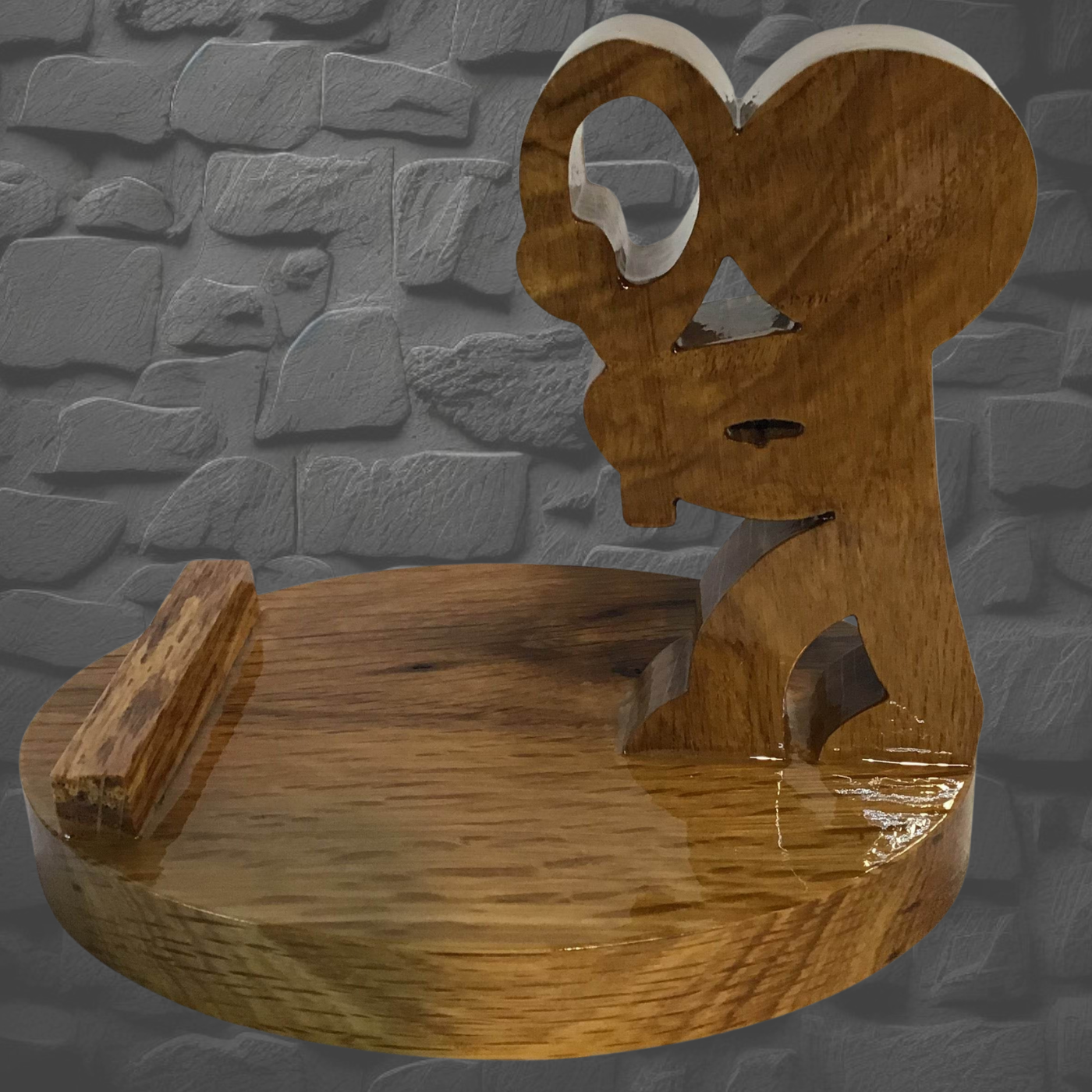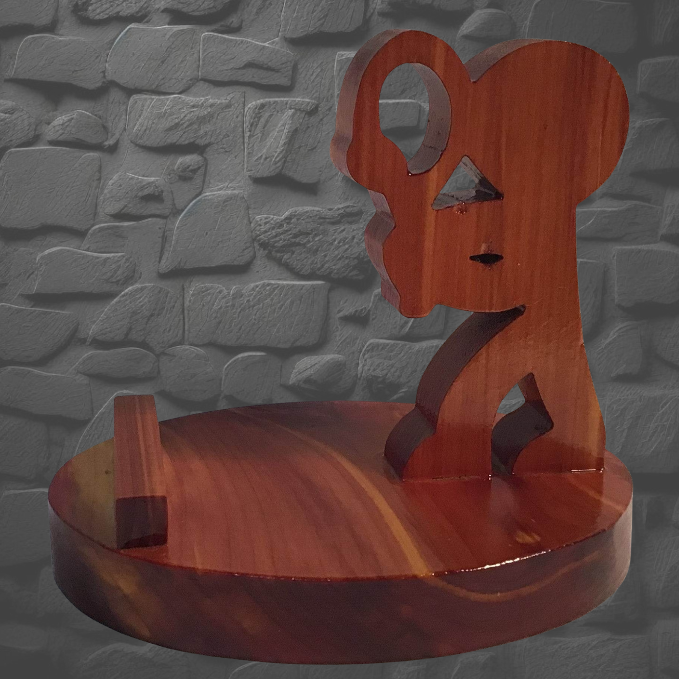 Handcrafted tennis player phone stand in Cedar or Oak, meticulously cut with a scroll saw and finished with five protective coats of polyurethane. Display your phone upright or sideways—perfect for video calls, recipe reading, or bedside browsing. Charge while positioned horizontally. Each piece is uniquely hand-finished, so colors may vary slightly. Handle with care.