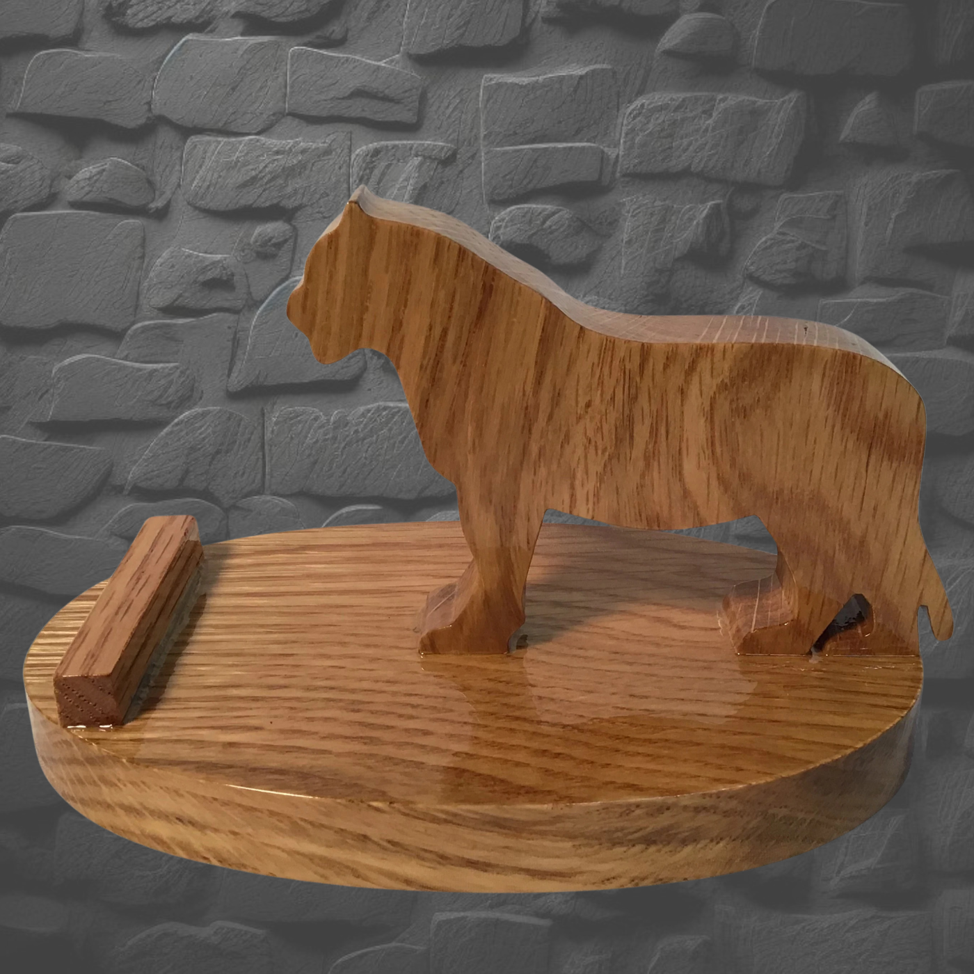 Tiger is a handcrafted wooden phone stand featuring a playful design cut from your choice of Cedar, Walnut, Burnt Pine, or Oak. Built on a sturdy medium base and finished with five protective coats of polyurethane, it holds your phone upright or sideways—perfect for video calls, recipe browsing, or bedside scrolling. Charge while positioned horizontally. Each piece is uniquely hand-cut, so colors vary slightly. Handle with care.