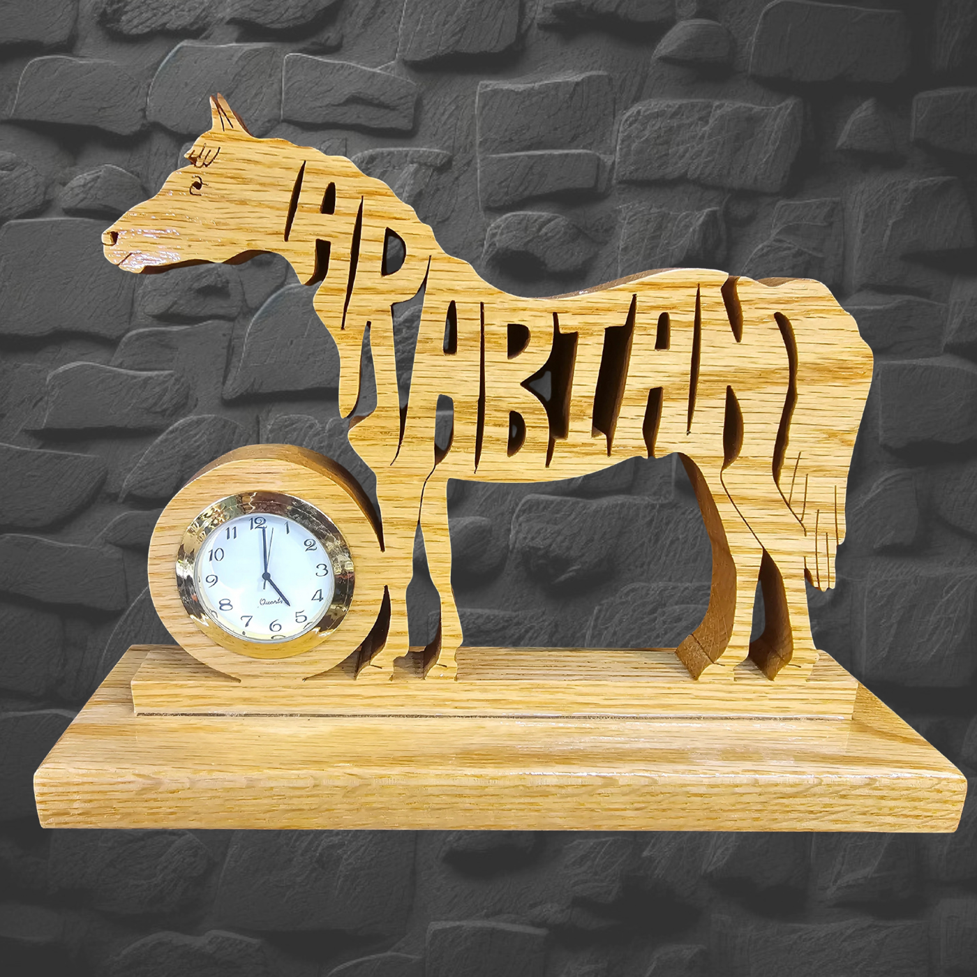 Arabian features a 2" insert that can be a clock or a photo frame—your choice! Swap out the battery or change the picture anytime by removing the insert. (Keep in mind, it’s either the clock or the photo, not both.) Hand-finished with five smooth coats of polyurethane, this piece measures about 2 3/4" x 9 3/4" x 7 1/2". Perfect for adding a little charm and time—or memories—to your space!