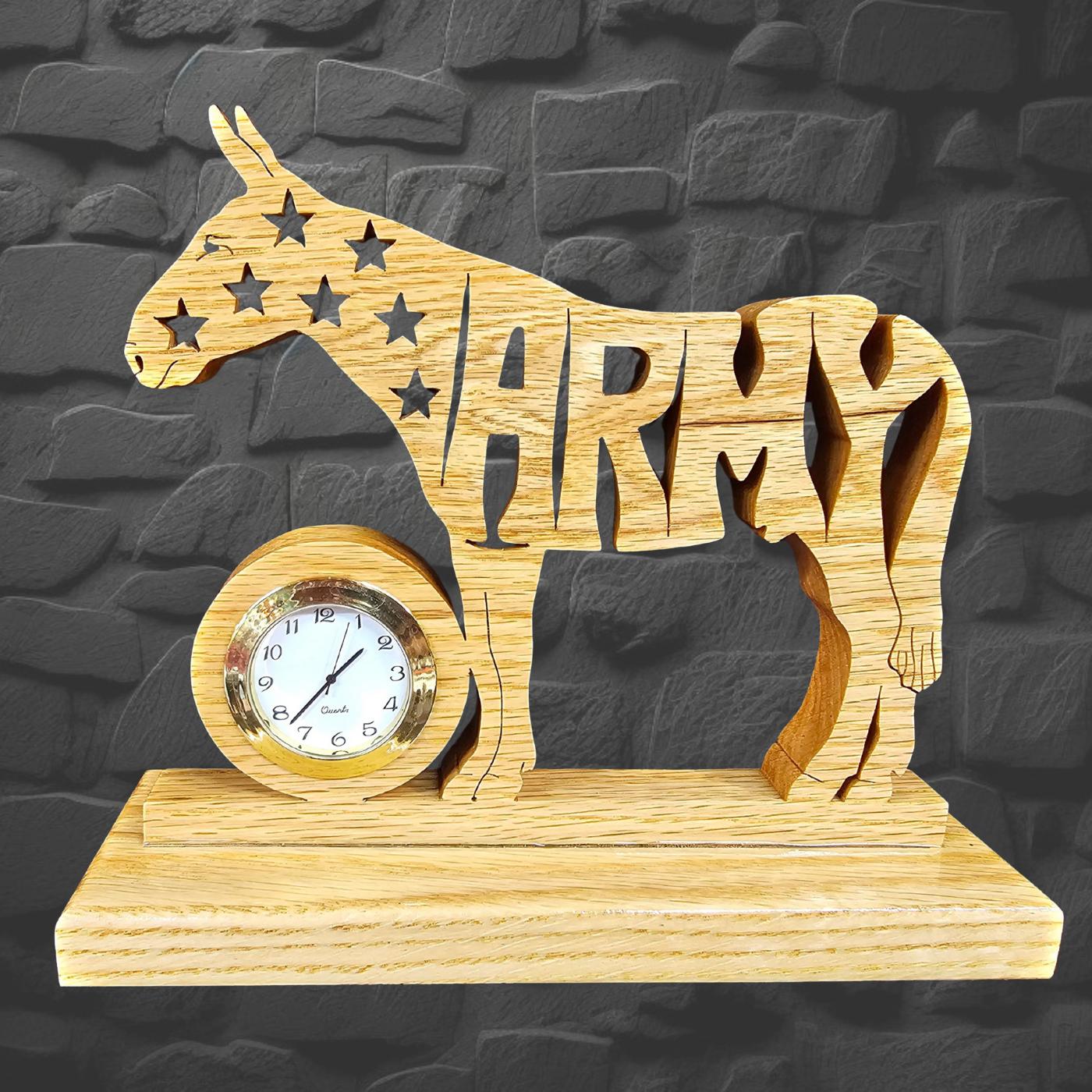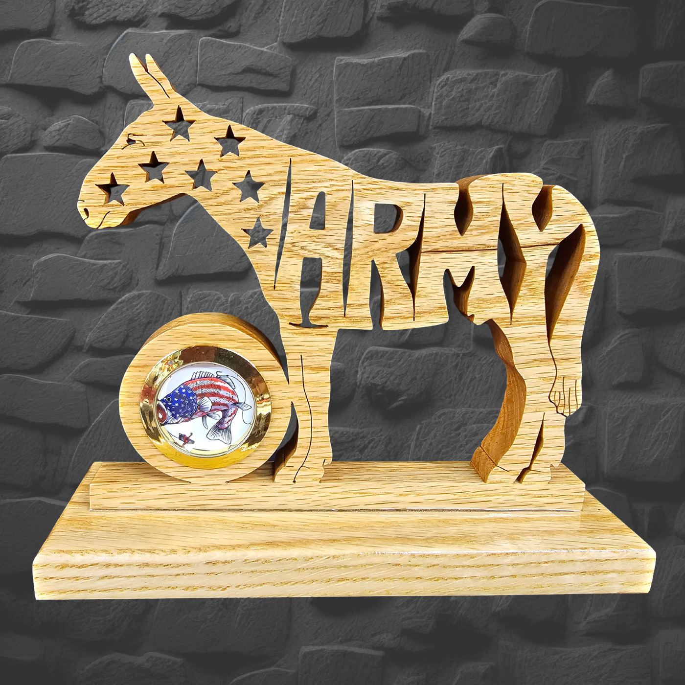 The Army features either a 2" clock insert or a picture insert—your choice! You can easily remove the insert to change the battery or swap in a photo. (Just a heads-up: you get one insert, not both.) It’s hand-finished with five coats of brushed-on polyurethane for that extra shine. The image is just a sample, so colors may vary a bit. Dimensions are about 2 3/4" x 9" x 7 1/2".