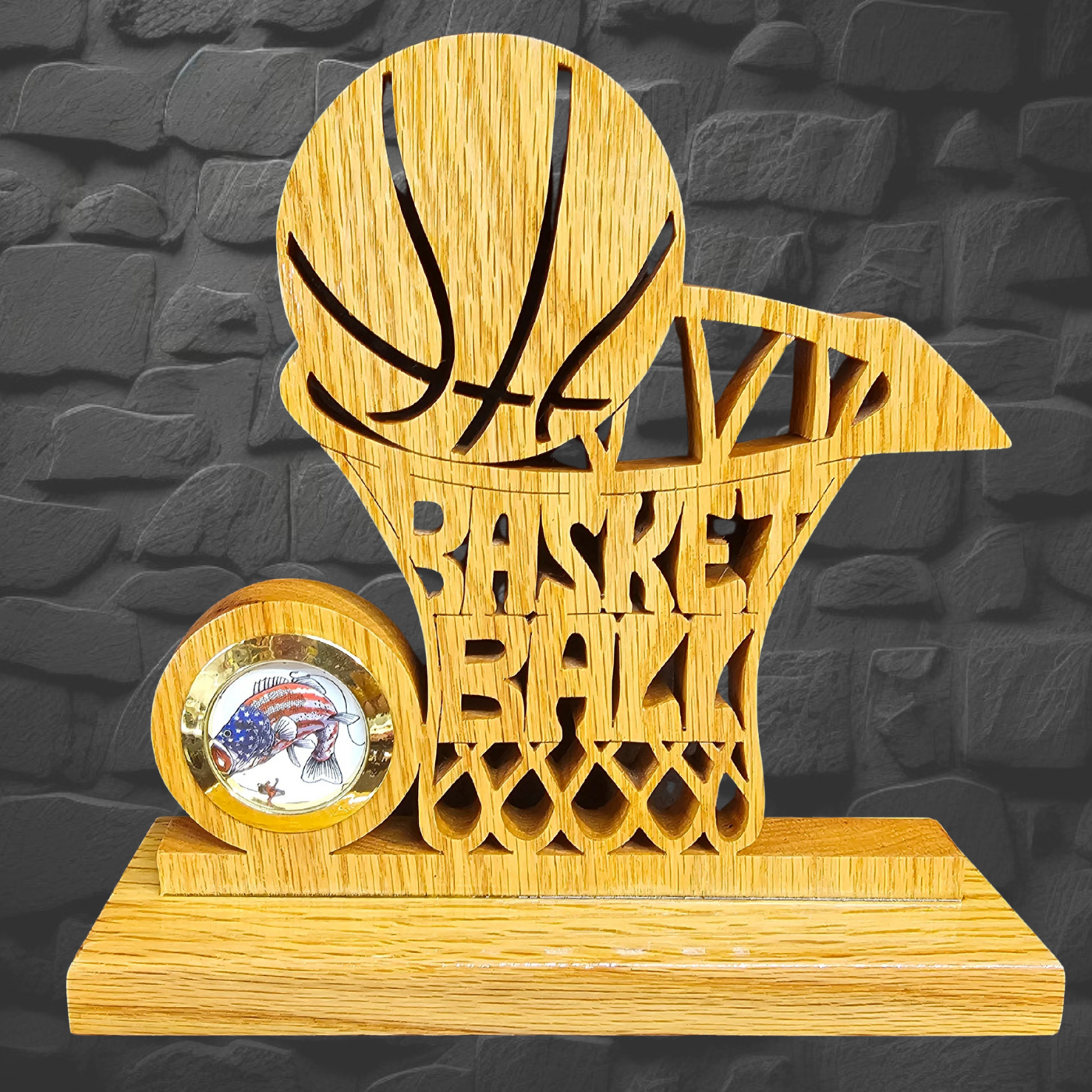 This basketball features a removable 2" clock or picture insert—you choose one, not both! Swap out the clock battery or slide in your favorite photo easily. Hand-finished with five brushed-on coats of polyurethane, it measures about 2 3/4" wide, 8 1/2" tall, and 9" long. Perfect for blending function with a personal touch!