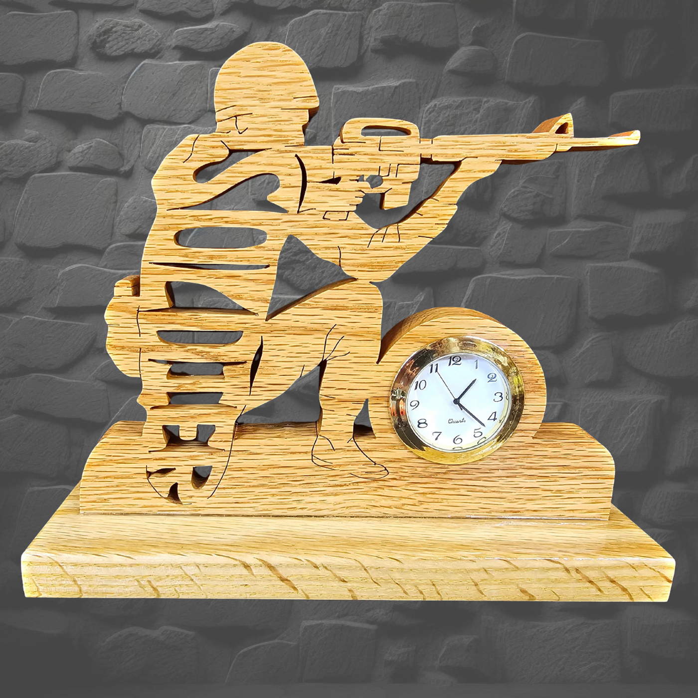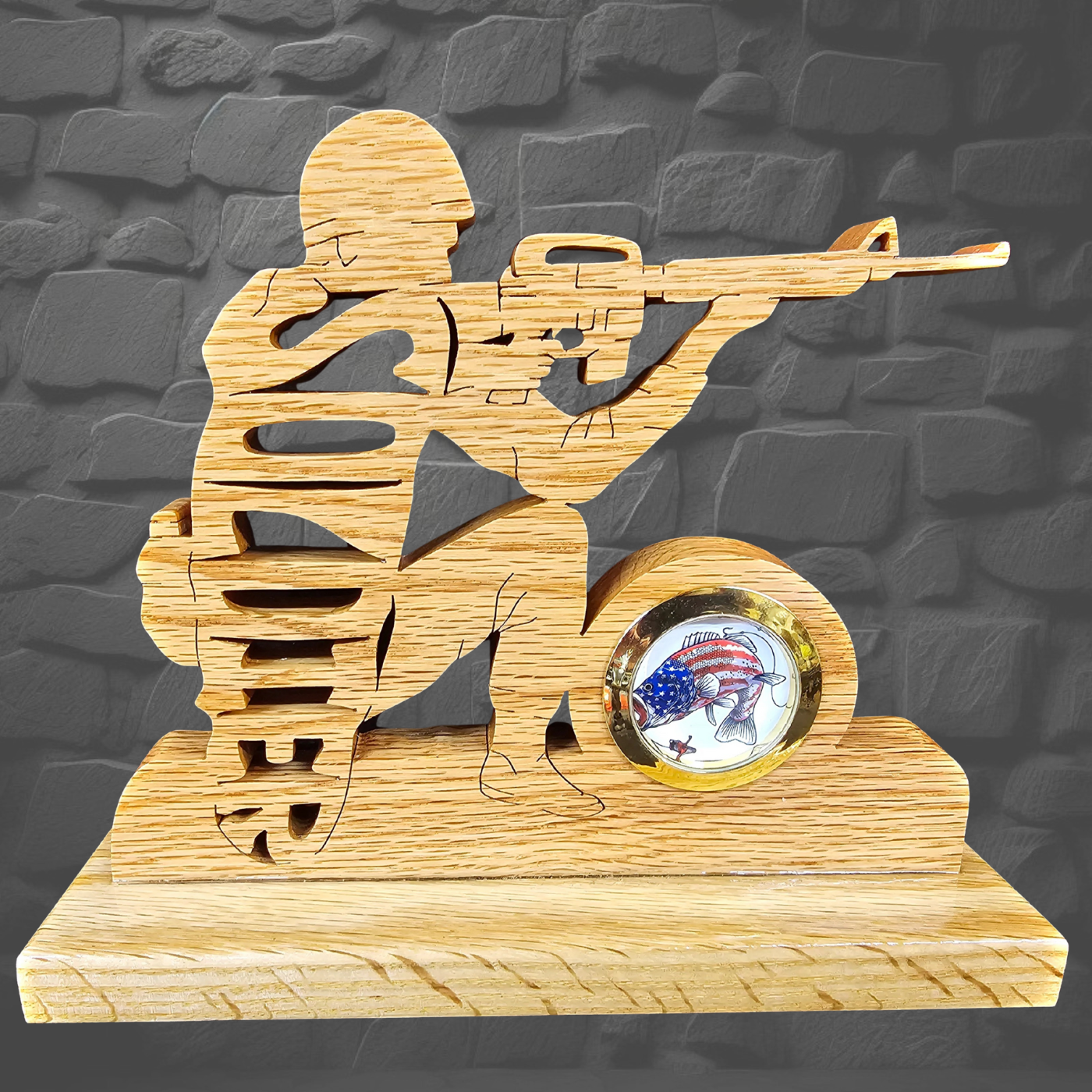 Soldier (Shooting) comes with a 2" clock insert or picture insert. The insert can be removed to replace battery when clock dies or to put a picture in. (You do not get both clock and picture insert, its one or the other) It is finished with polyurethane by hand, 5 coats brushes on. Picture is a representation of the product you will receive. Coloration will vary slightly. It measured approximately 2 3/4" x 9"L x 8"H