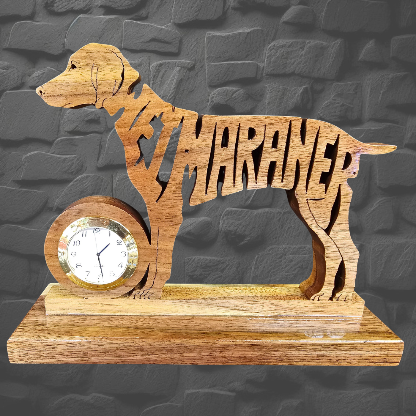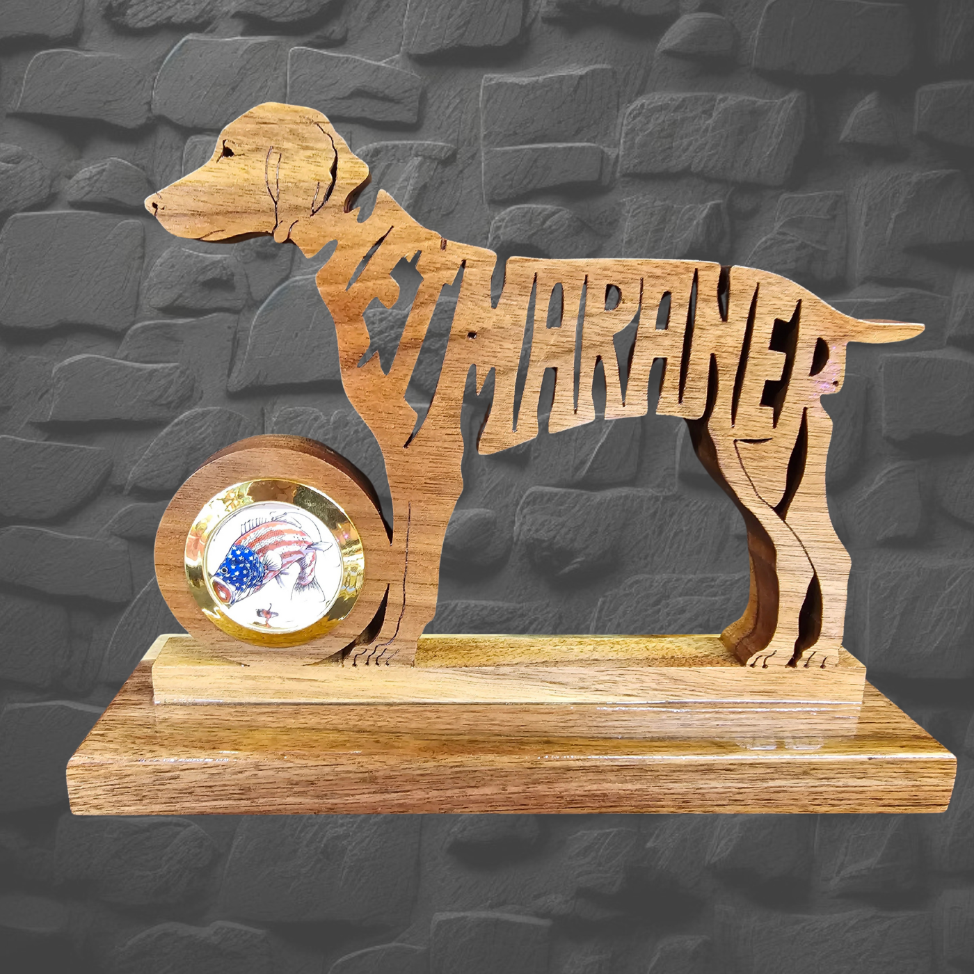 This charming Weimaraner piece features your choice of a 2" clock insert or picture insert—pick whichever speaks to your heart! Swapping them out is a breeze when it's time to change the battery or showcase a cherished photo. Hand-finished with five coats of polyurethane for a beautiful, durable shine, each piece is uniquely crafted with natural color variations that make it one-of-a-kind. Measuring roughly 2¾" wide by 9½" long and 7" tall, it's the perfect size to brighten up any shelf or desk. (Note: You'll choose either the clock or picture insert—not both!)