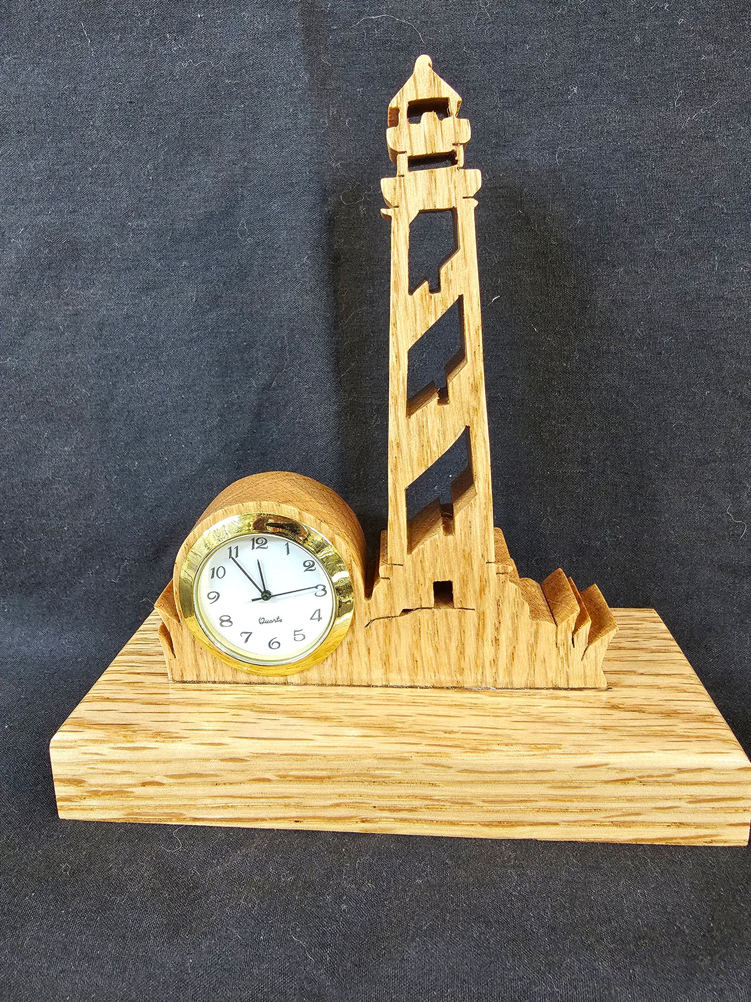 Lighthouse comes with 1 7/16th clock insert in them. It can be removed easily to put new battery if needed. They all come finished with Shellac to give them a medium gloss finished. Approximate size is 5"W x 5 1/2" T x 2" D x 1/2"