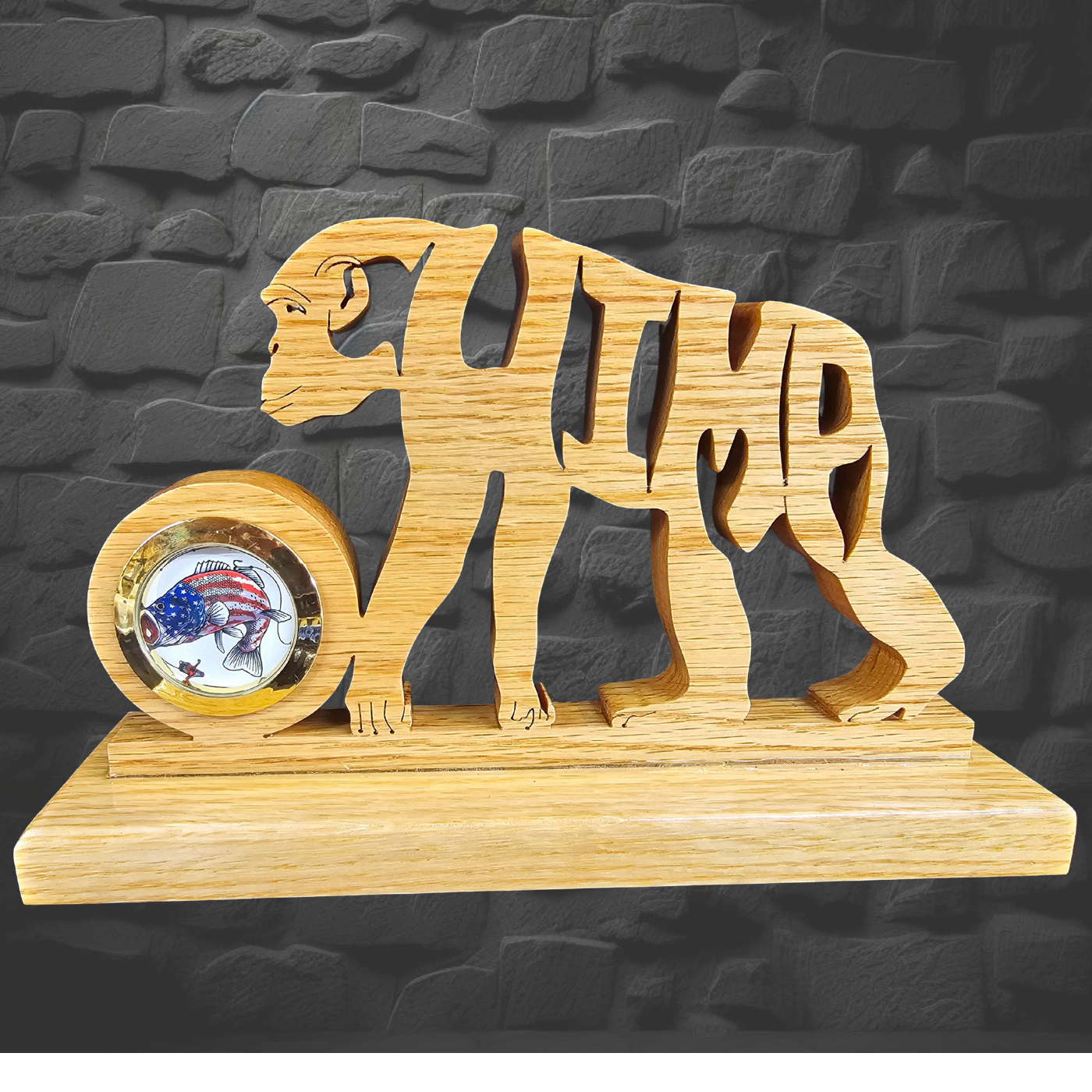 Chimp includes either a 2" clock insert or a picture insert—your choice! You can easily swap the insert to change the battery or switch between clock and photo (just one insert included, not both). Hand-finished with five smooth coats of polyurethane, Chimp measures about 2 3/4" x 9 1/2"L x 6"H, ready to brighten your space with charm and fun.