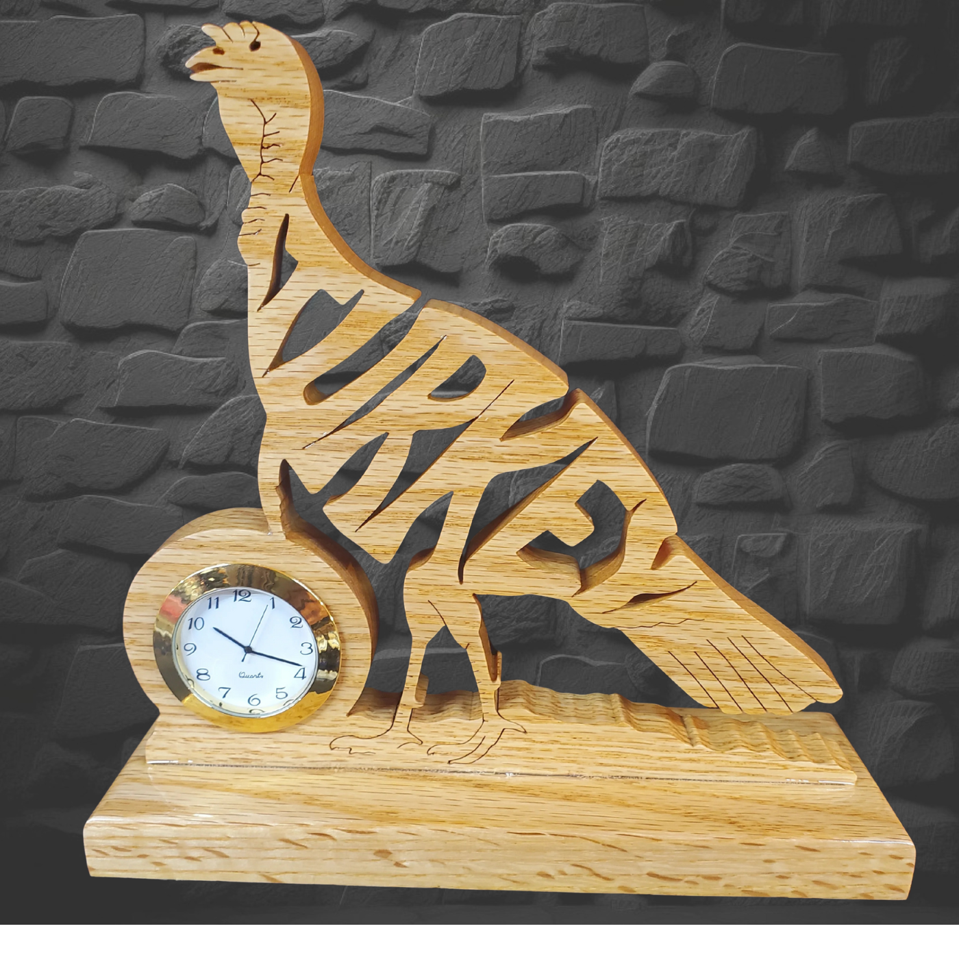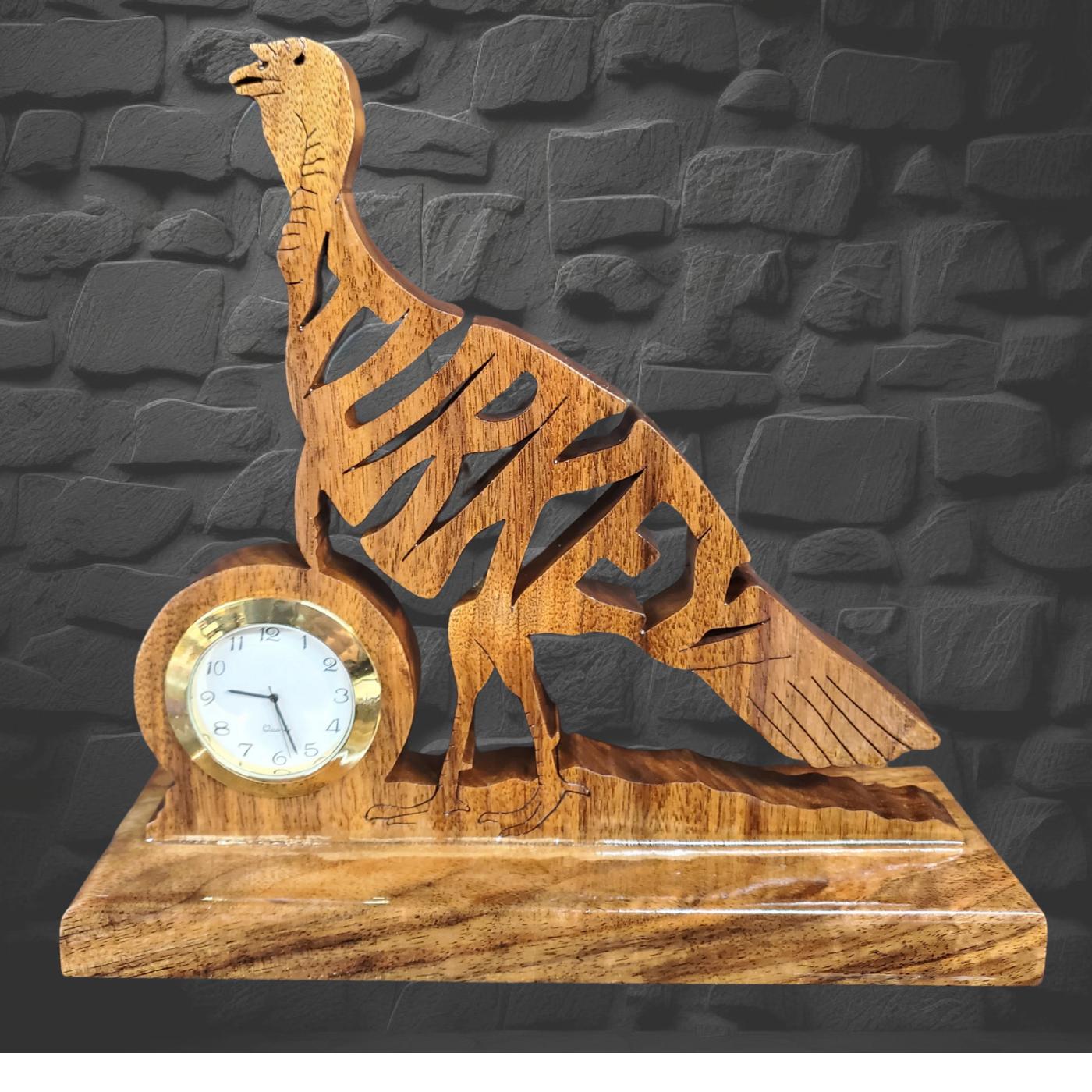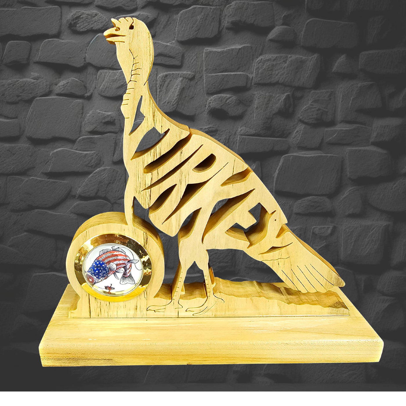 This Turkey features a 2" insert that can be either a clock or a picture frame—your choice! The insert is easily removable to swap batteries or change photos. Note: you get either the clock or the picture insert, not both. Finished by hand with five coats of brushed-on polyurethane, each piece has its own unique slight color variations. Measures about 2 3/4" wide, 8 1/2" long, and 8" high. The photo shows an example of what you’ll receive!
