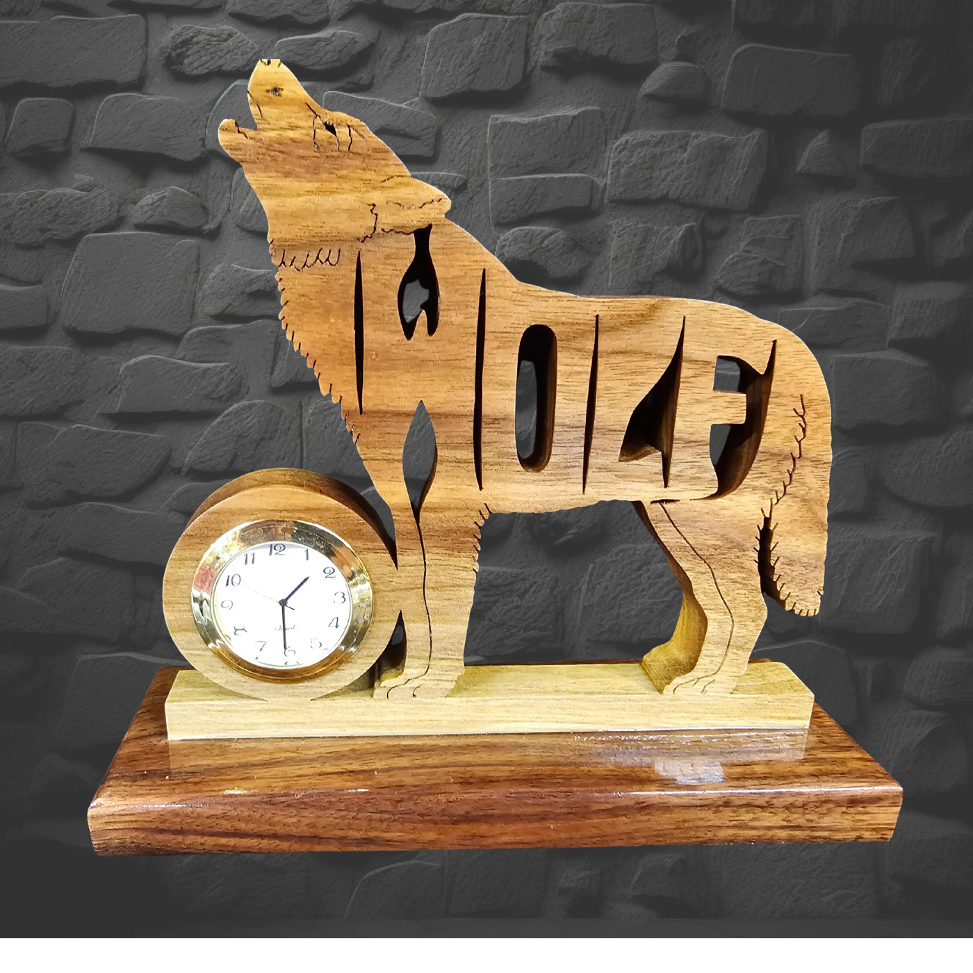 Wolf (Howling) features a 2" insert that you can choose as either a clock or a picture frame. You can easily swap out the insert to change the battery or display your favorite photo. (Note: you get one insert option, not both.) Hand-finished with five coats of brushed-on polyurethane, each piece is unique with slight color variations. Measures roughly 2 3/4" by [dimensions]. The image shows a typical product—you’ll receive your own special one!