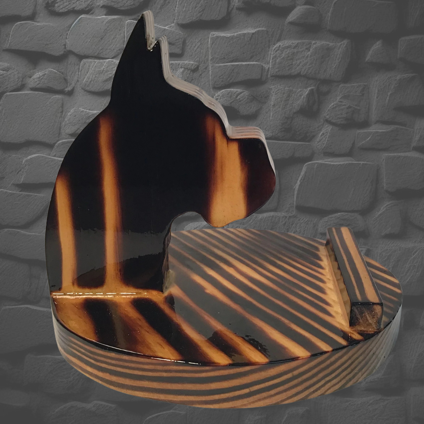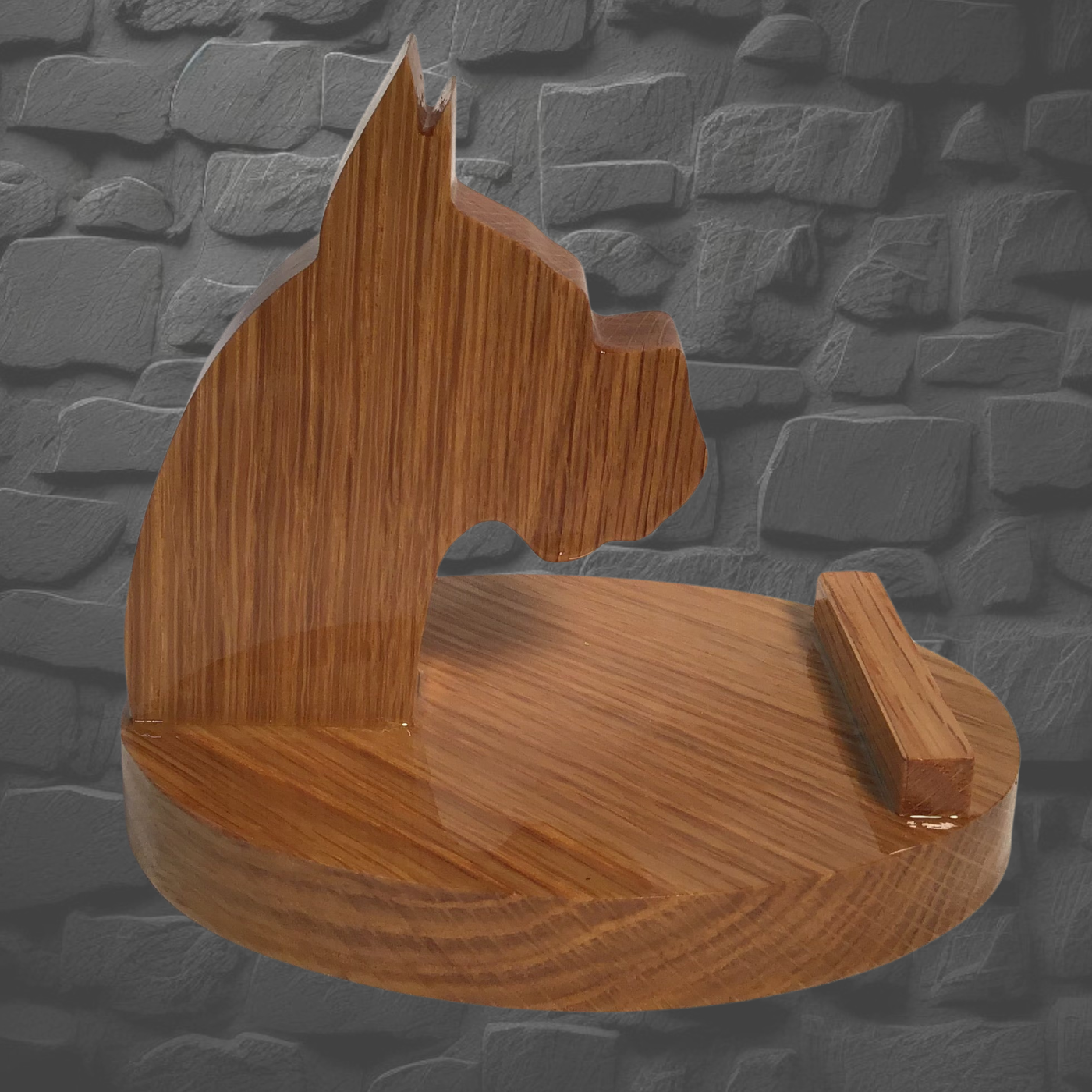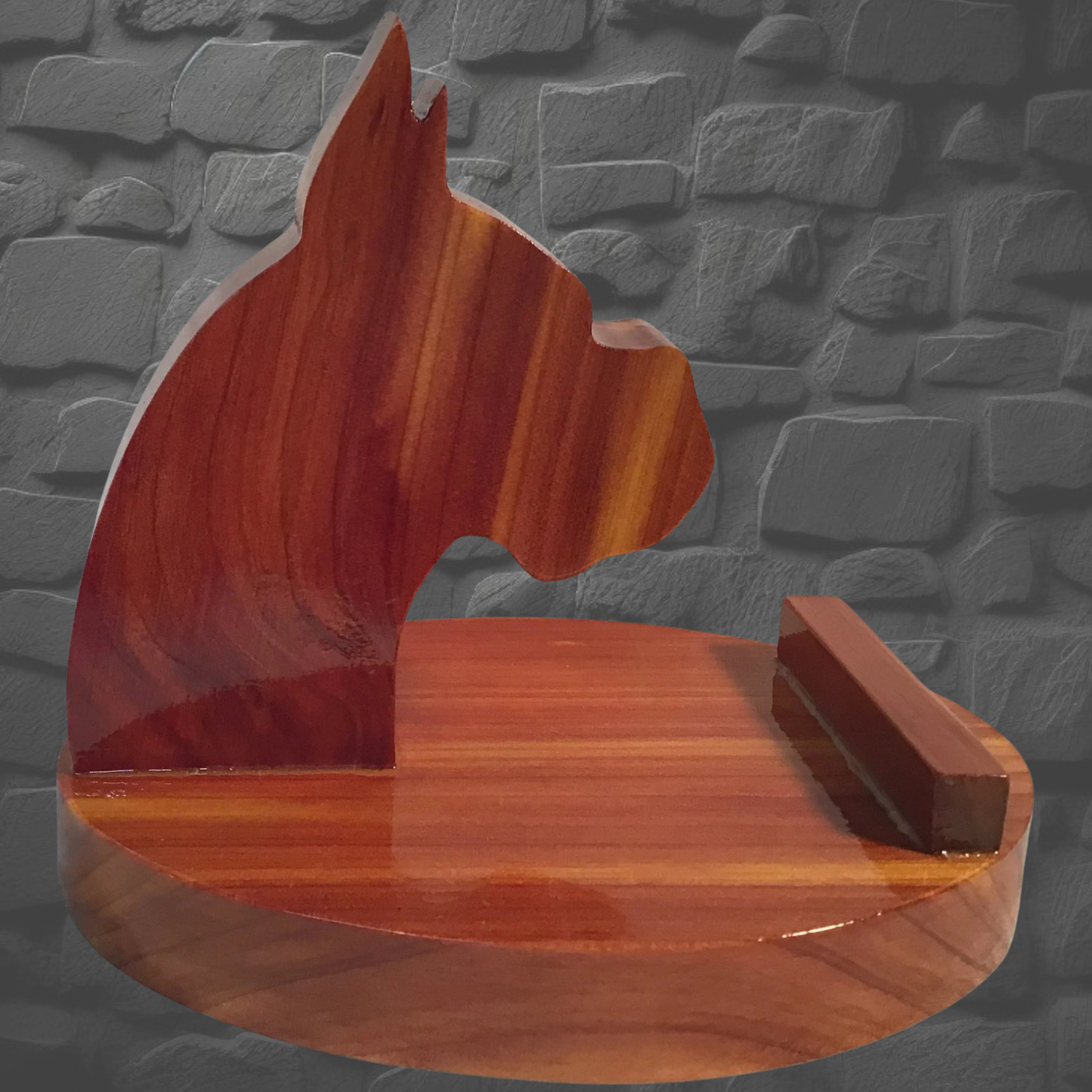 Boxer Head comes in 4 different woods, Cedar, Walnut, Burnt Pine and Oak. This piece is on the small base that we do. These pieces are hand cut with a scroll saw. Each piece is brush finished with 5 coats of Polyurethane to give it a deep, rich, thick coat. You can put your phone on it in a upright or sideways position so you can watch videos or even if you using your camera for video calls. If you put your phone sideways you can charge your phone in this position. They come in handy for various applications, like putting it beside your bed on the nightstand while you sleep so makes it easier to find. You can use it in the kitchen if you are trying to cook up a new recipe without it laying on the counter so your phone doesn't get wet or something poured on it. Plus it makes it easy for you to read the recipe hands free without having to pick it up to see it. (Photos are representation of the product, not the actual piece you will receive. Colors could variant some from piece to piece) (These pieces could break if dropped.)