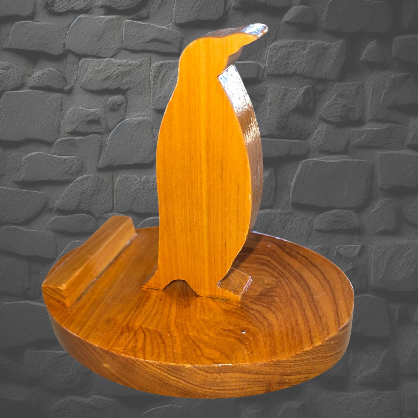 Penguin comes in 4 different woods, Cedar, Walnut, Burnt Pine and Oak. This piece is on the small base that we do. These pieces are hand cut with a scroll saw. Each piece is brush finished with 5 coats of Polyurethane to give it a deep, rich, thick coat. You can put your phone on it in a upright or sideways position so you can watch videos or even if you using your camera for video calls. If you put your phone sideways you can charge your phone in this position. They come in handy for various applications, like putting it beside your bed on the nightstand while you sleep so makes it easier to find. You can use it in the kitchen if you are trying to cook up a new recipe without it laying on the counter so your phone doesn't get wet or something poured on it. Plus it makes it easy for you to read the recipe hands free without having to pick it up to see it. (Photos are representation of the product, not the actual piece you will receive. Colors could variant some from piece to piece) (These pieces could break if dropped.)