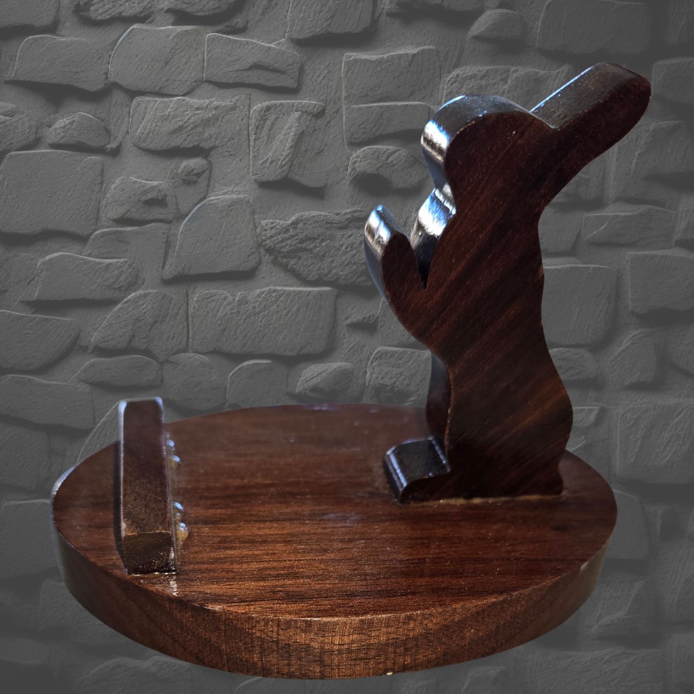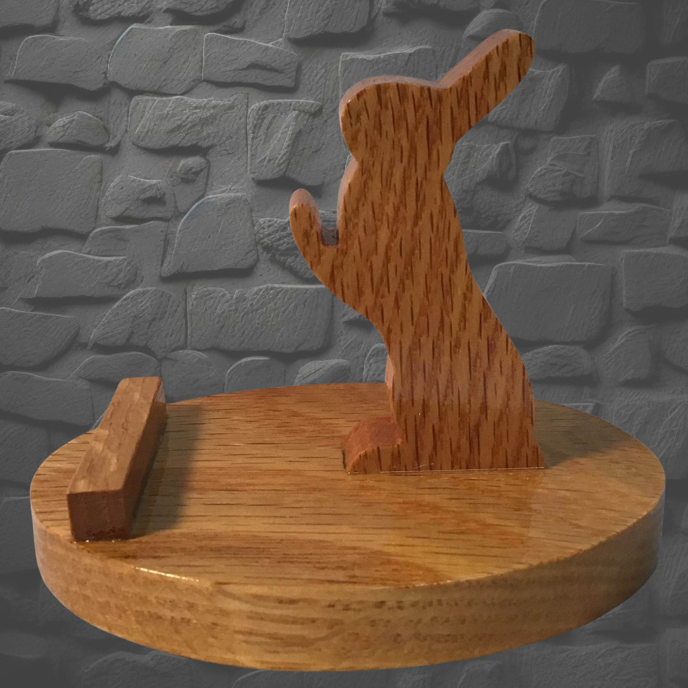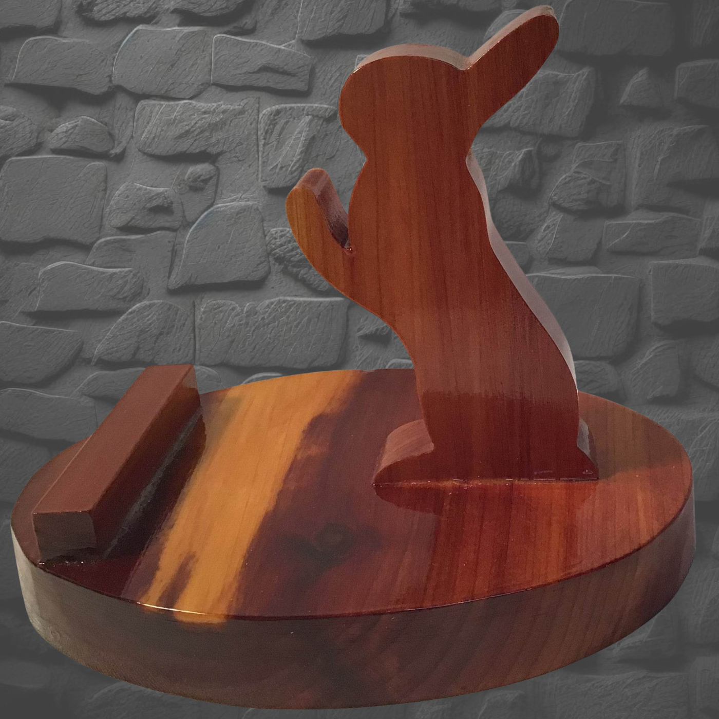 Handcrafted wooden phone stand featuring a charming rabbit design. Available in four beautiful wood options: Cedar, Walnut, Burnt Pine, and Oak. Each piece is meticulously hand-cut with a scroll saw and finished with five protective coats of polyurethane. Perfect for propping your phone upright or sideways—ideal for video calls, recipe browsing, or bedside convenience. Charge while positioned horizontally. A delightful blend of function and woodland charm!
