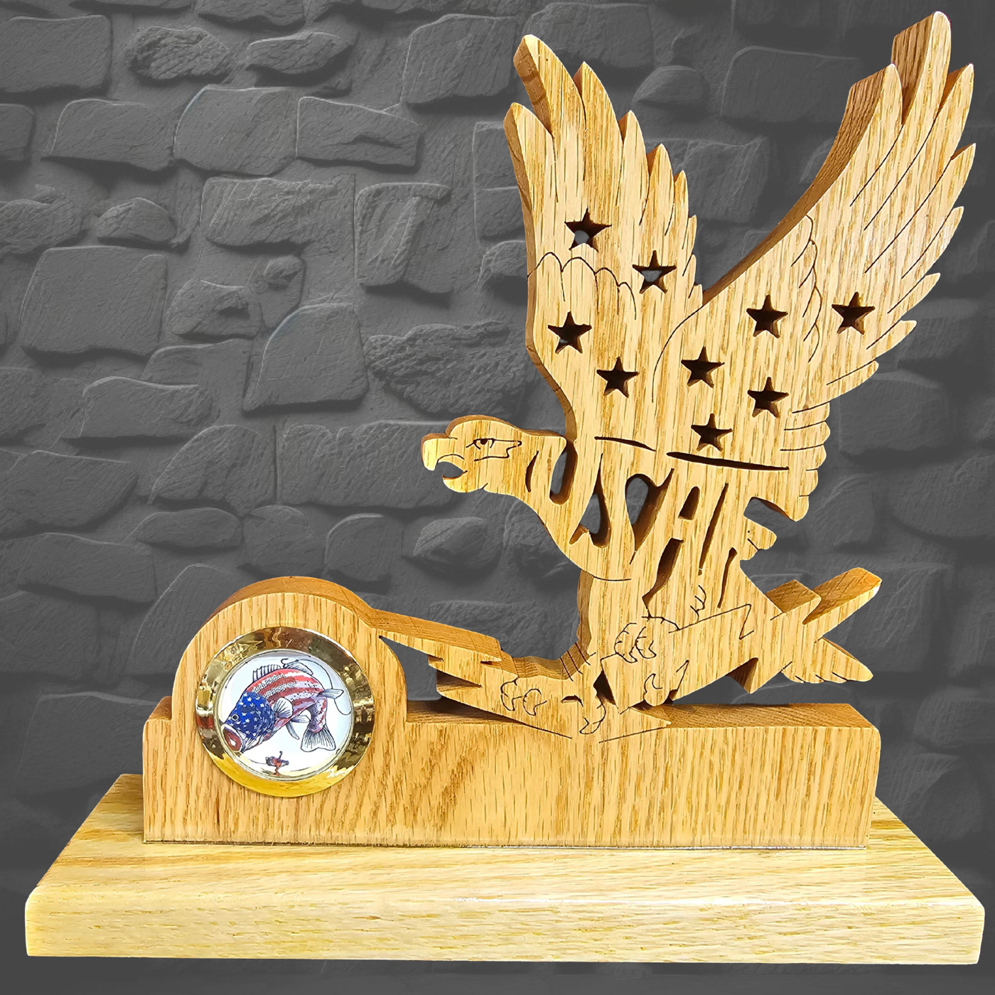 USAF comes with a 2" clock insert or picture insert. The insert can be removed to replace battery when clock dies or to put a picture in. (You do not get both clock and picture insert, its one or the other) It is finished with polyurethane by hand, 5 coats brushes on. It measured approximately 2 3/4" x 10"L x 10"H