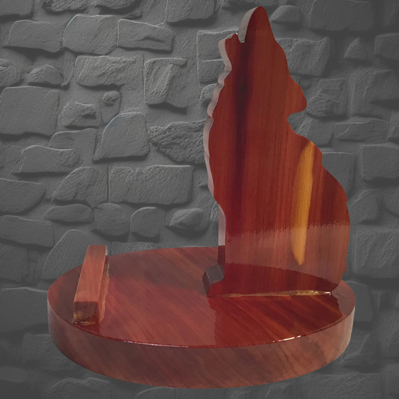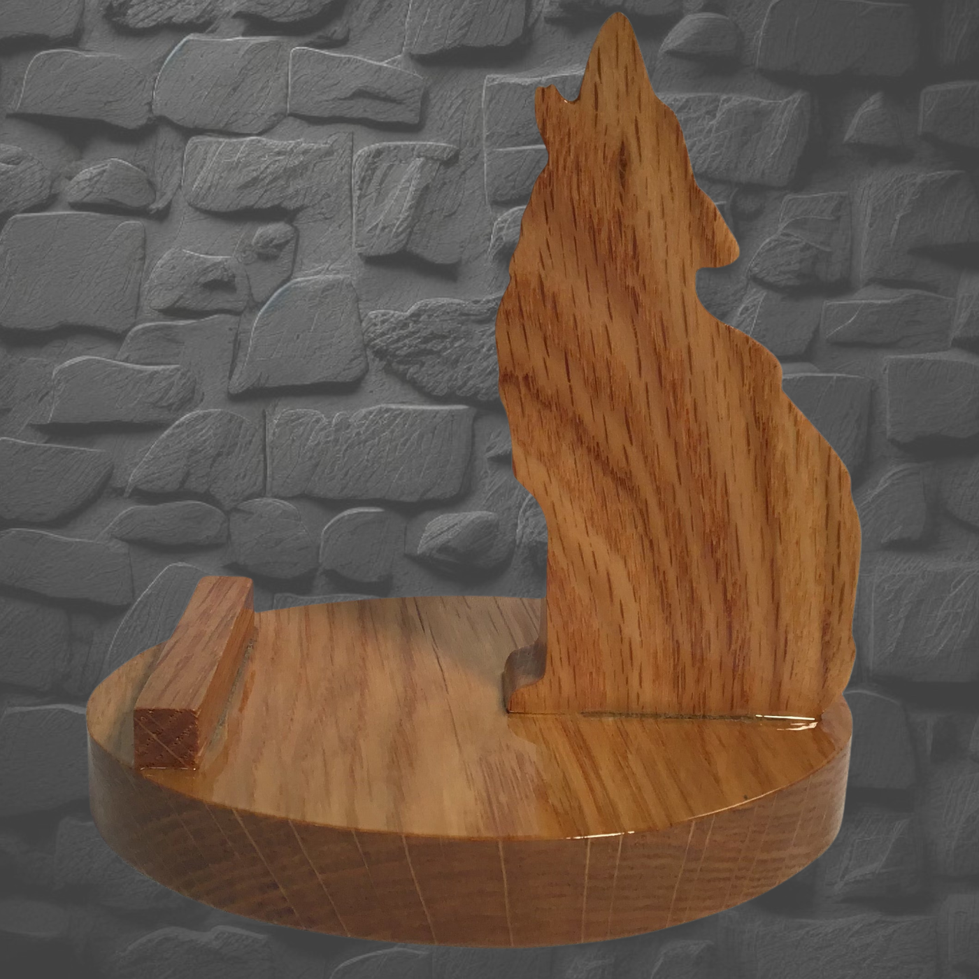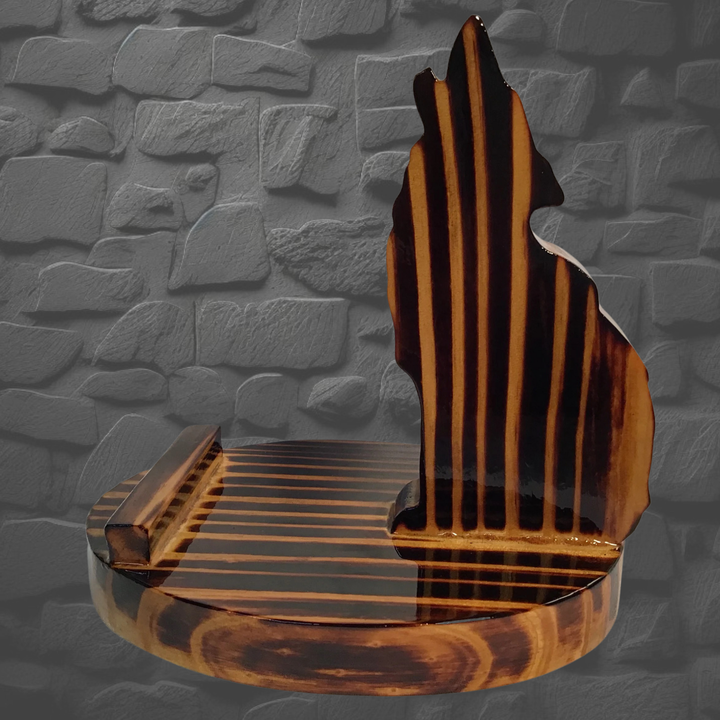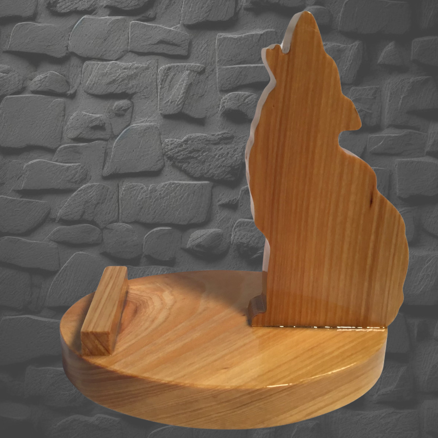Wolf is a hand-cut wooden phone stand crafted from your choice of Cedar, Walnut, Burnt Pine, or Oak. Each piece features a protective five-coat polyurethane finish for durability and depth. Position your phone upright or sideways to watch videos, join calls, or follow recipes hands-free. Charge while it sits sideways. Perfect for bedside, kitchen, or anywhere you need your phone within easy reach. Small base design keeps it compact. Wood grain and color vary naturally by piece.